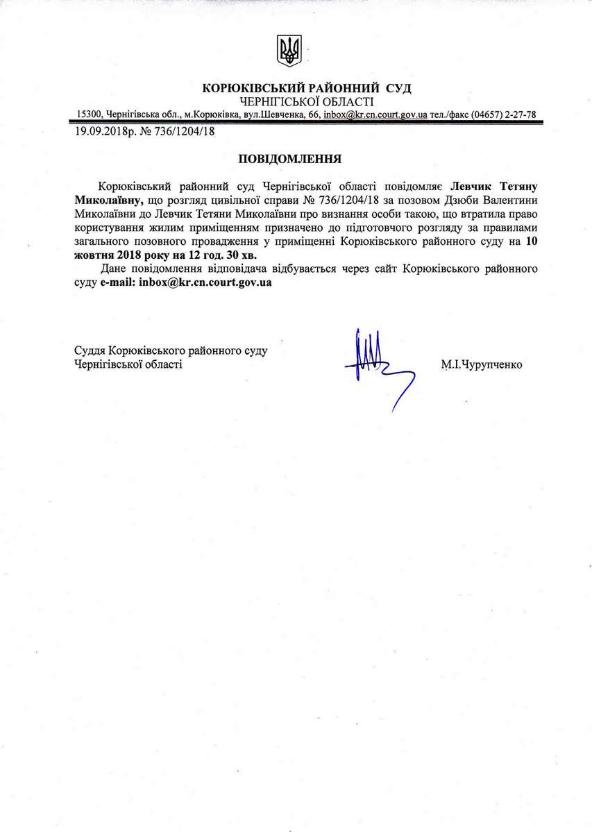 Повідомлення від 19.09.2018 про виклик до суду Левчик Тетяну Миколаївну