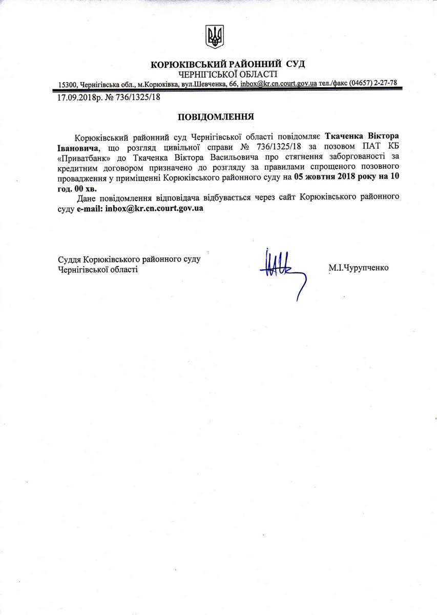 Повідомлення від 17.09.2018 про виклик до суду Ткаченка Віктора Івановича