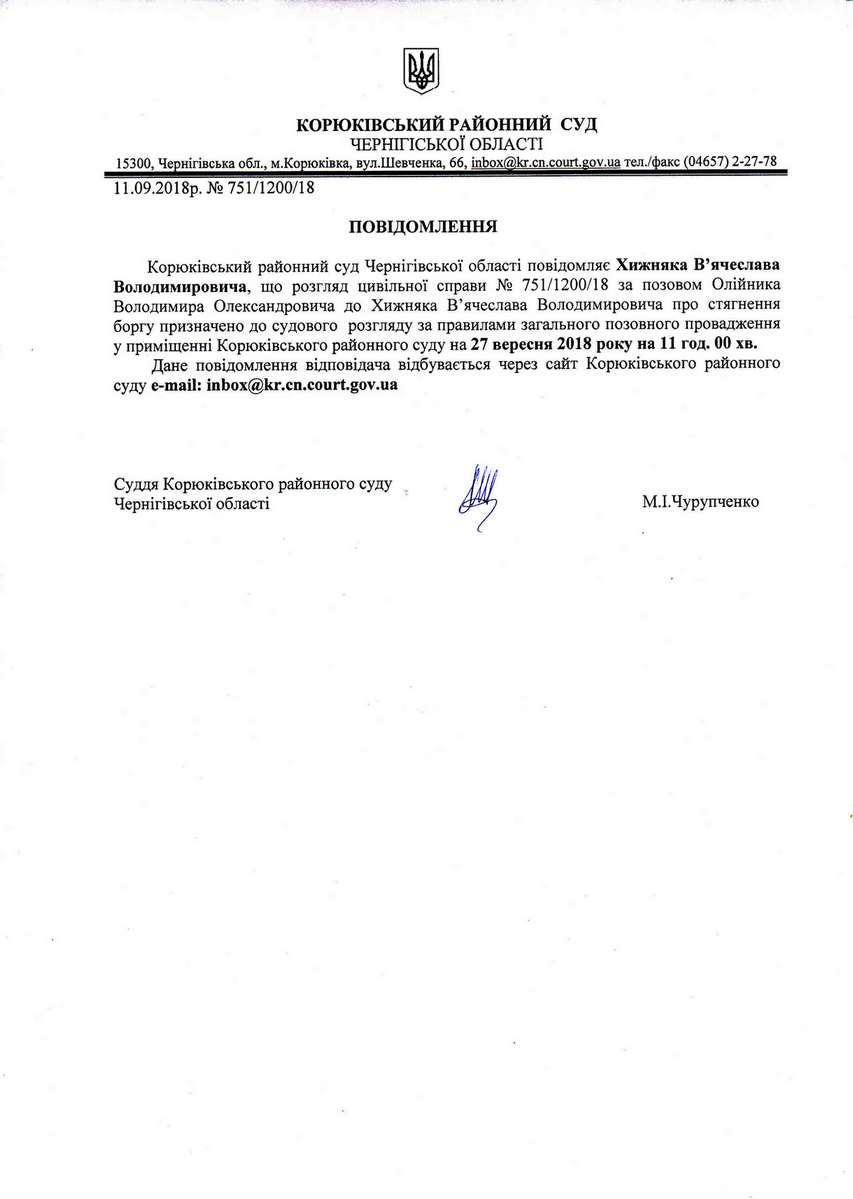 Повідомлення від 11.09.2018 про виклик до суду Хижняка В'ячеслава Володимировича