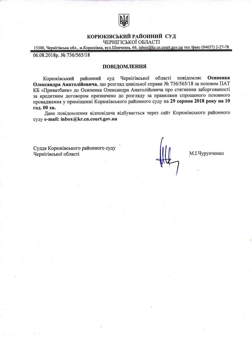 Повідомлення від 06.08.2018 про виклик до суду Осипенка Олександра Анатолійовича
