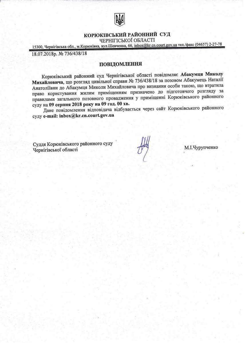 Повідомлення від 18.07.2018 про виклик до суду Абакумця Миколу Михайловича
