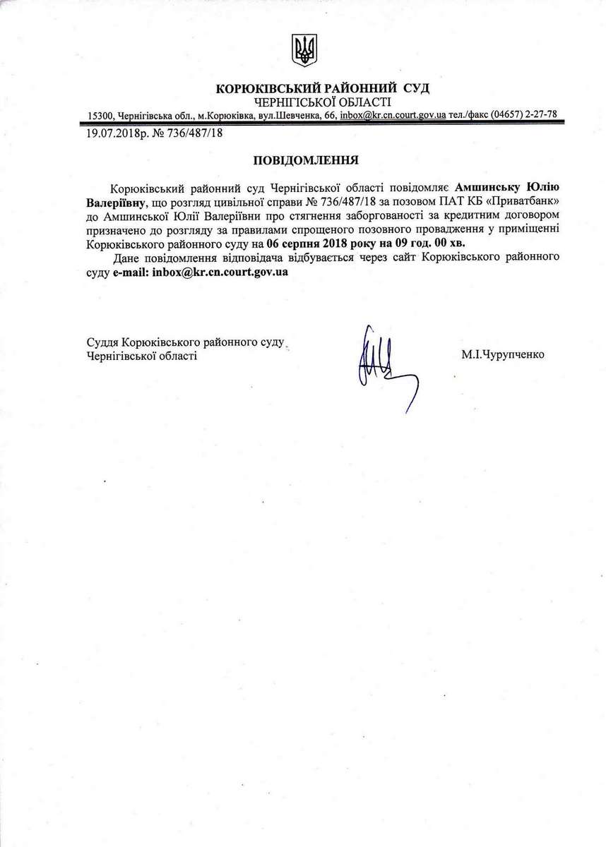 Повідомлення від 19.07.2018 про виклик до суду Амшинську Юлію Валеріївну