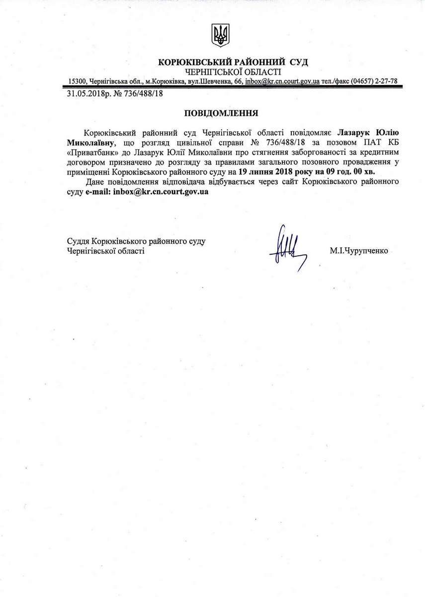 Повідомлення від 31.05.2018 про виклик до суду Лазарук Юлію Миколаївну