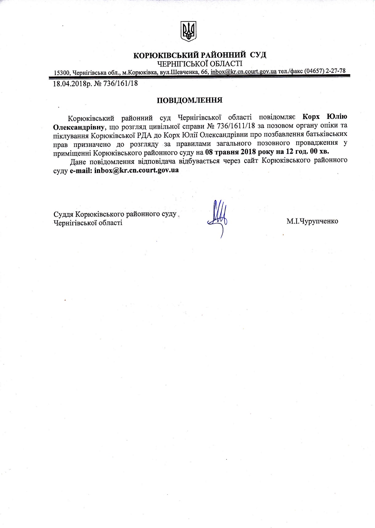 Повідомлення від 18.04.2018 про виклик до суду Корх Юлії Олександрівни