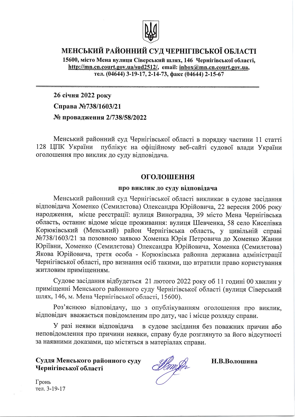 Оголошення про виклик до суду Хоменко (Семилєтова) Олександра Юрійовича