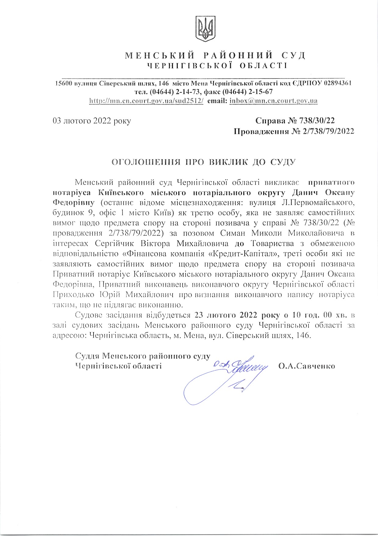 Оголошення про виклик до суду приватного нотаріуса Київського міського нотаріального округу Данич Оксану Федорівну