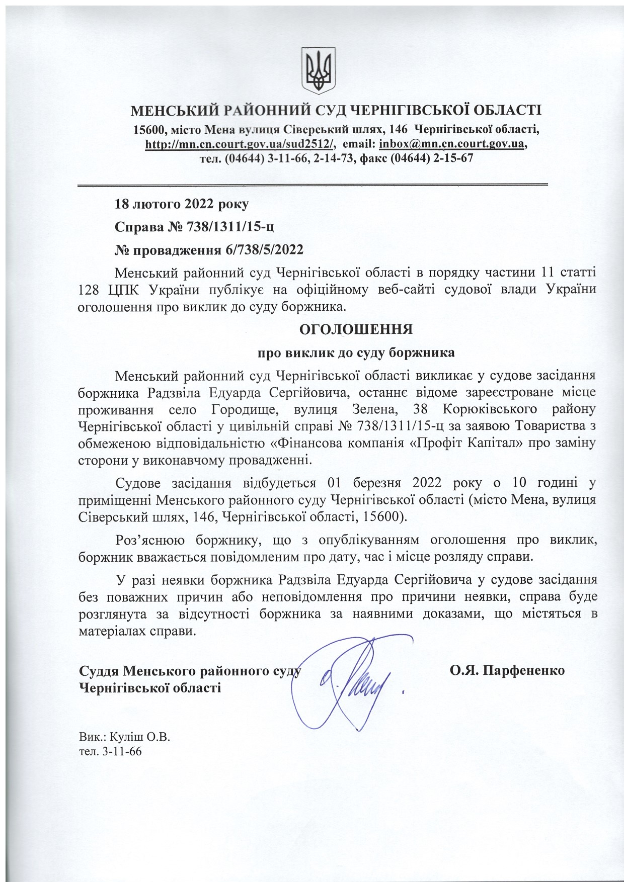 Оголошення про виклик до суду Радзвіла Едуарда Сергійовича