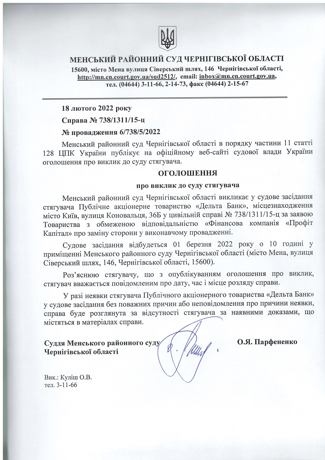 Оголошення про виклик до суду стягувача Публічне акціонерне товариство "Дельта банк"