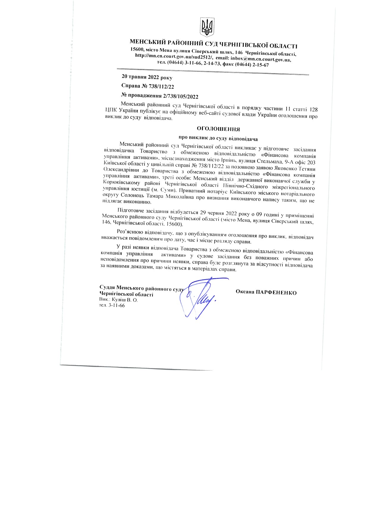Оголошення про виклик до суду Товариство з обмеженою відповідальністю "Фінансова компанія управління активами"