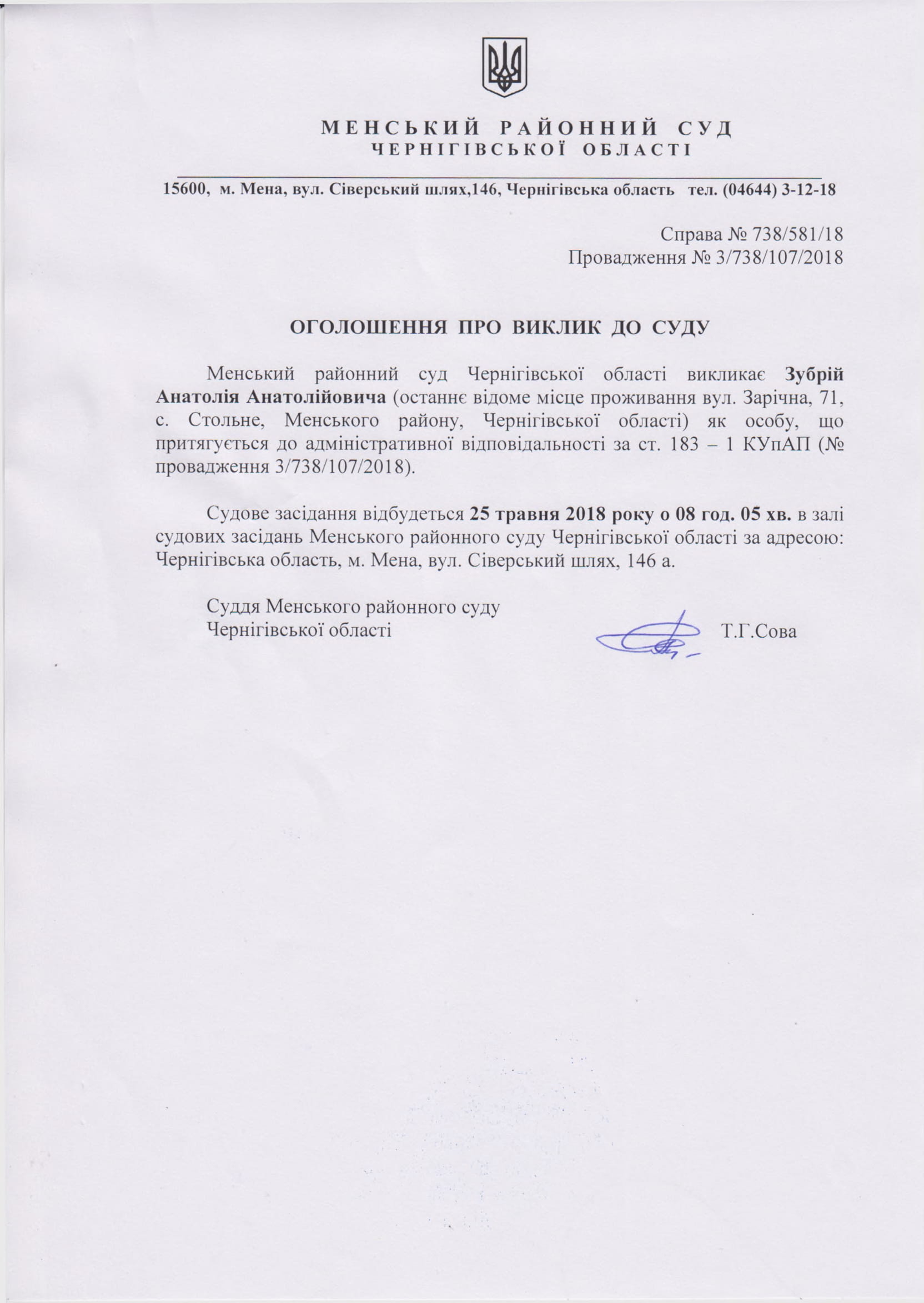 Оголошення про виклик до суду Зубрій Анатолія Анатолійовича