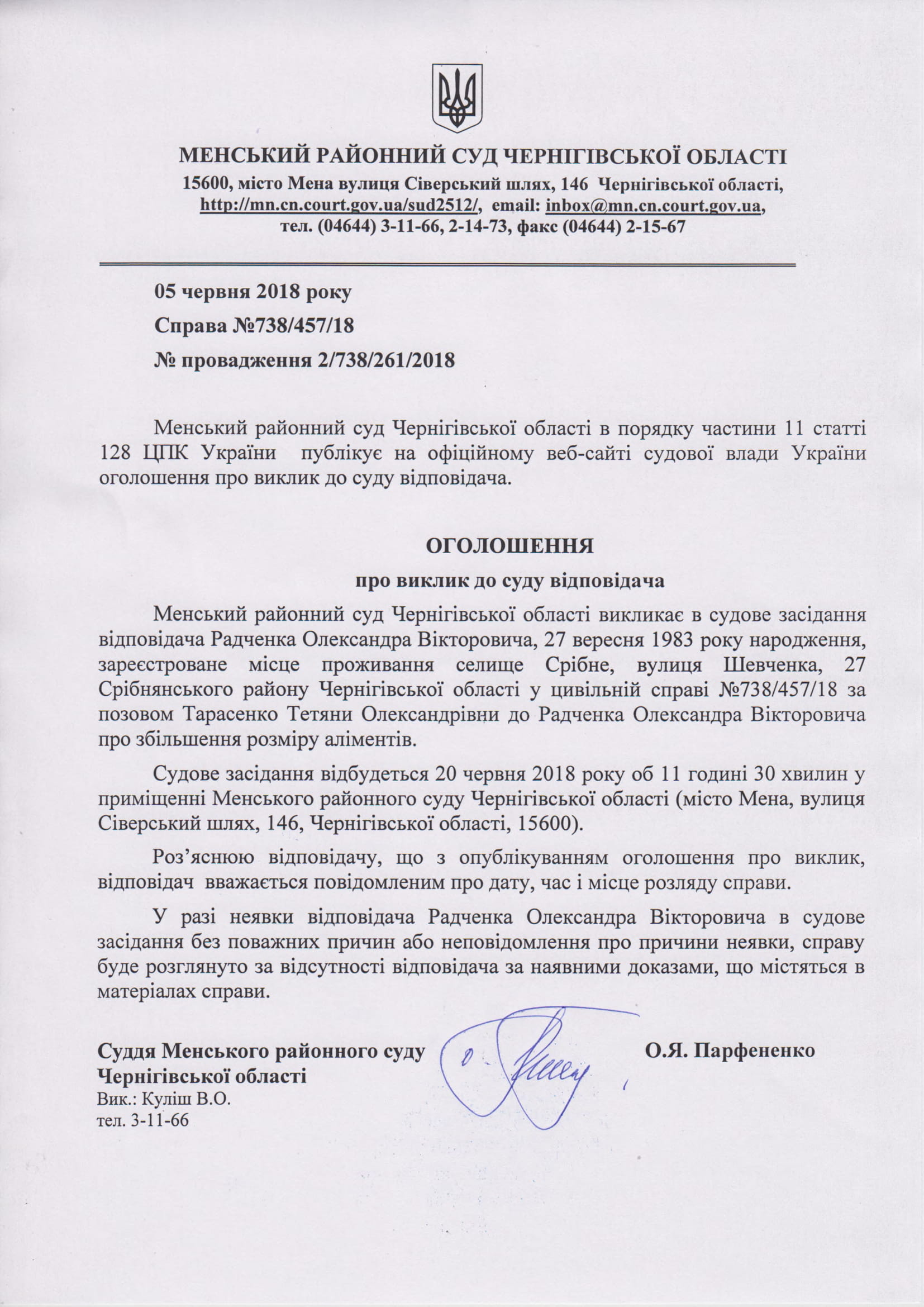 Оголошення про виклик до суду Радченко Олександра Вікторовича