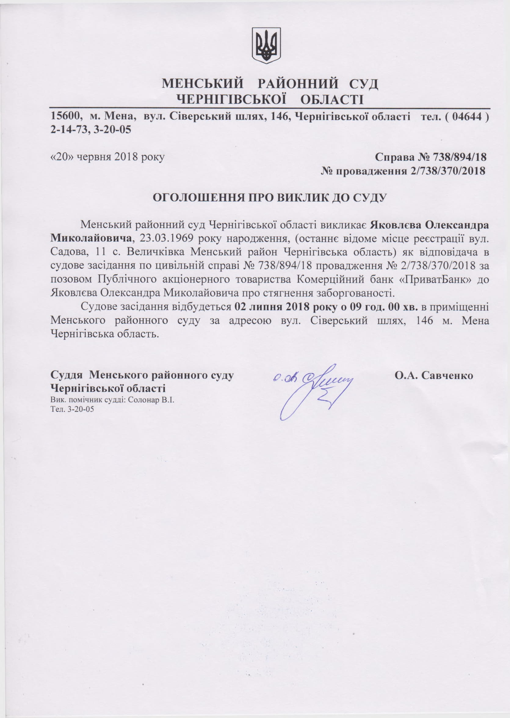 Оголошення про виклик до суду Яковлєва Олександра Миколайовича