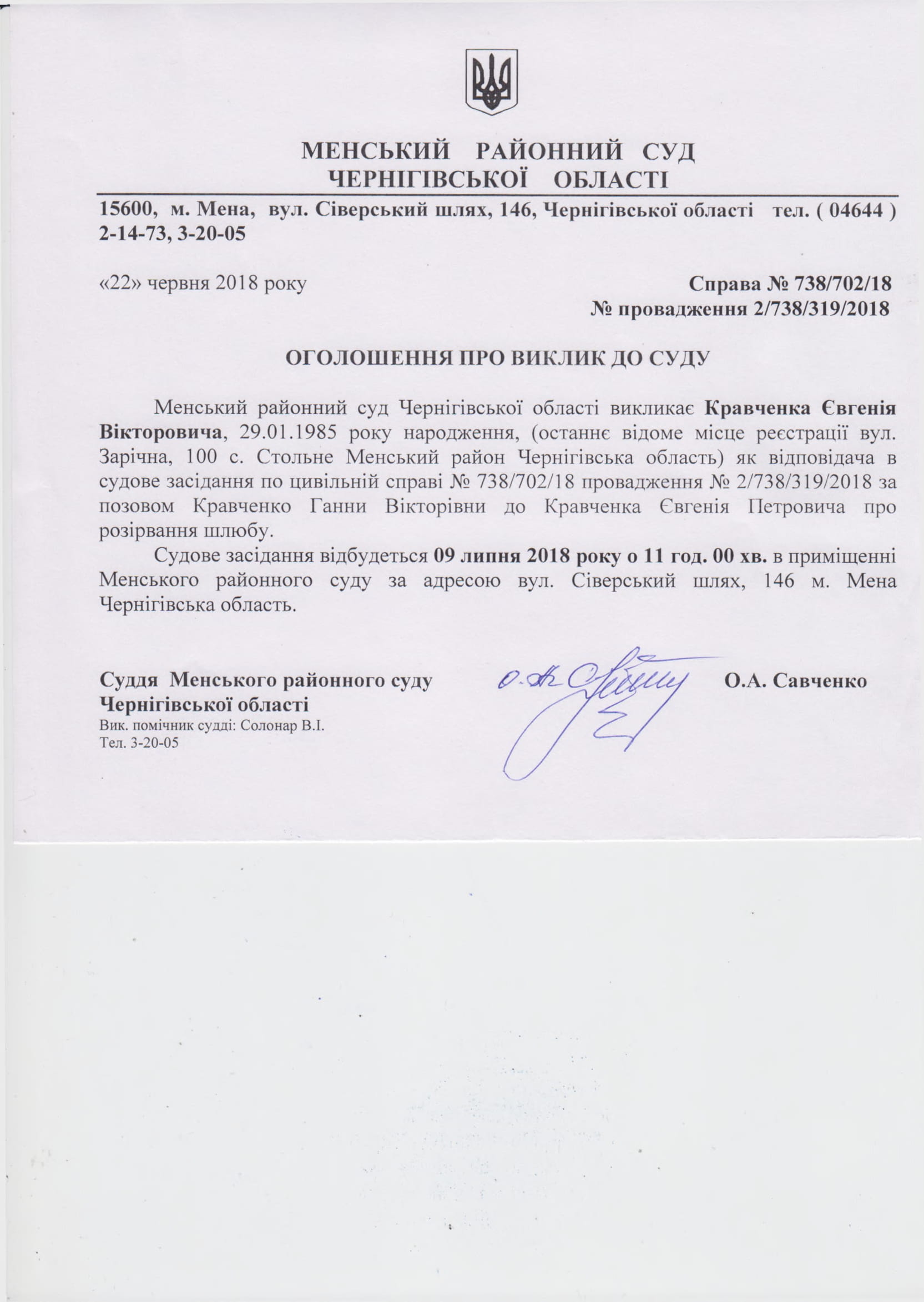 Оголошення про виклик до суду Кравченка Євгенія Вікторовича