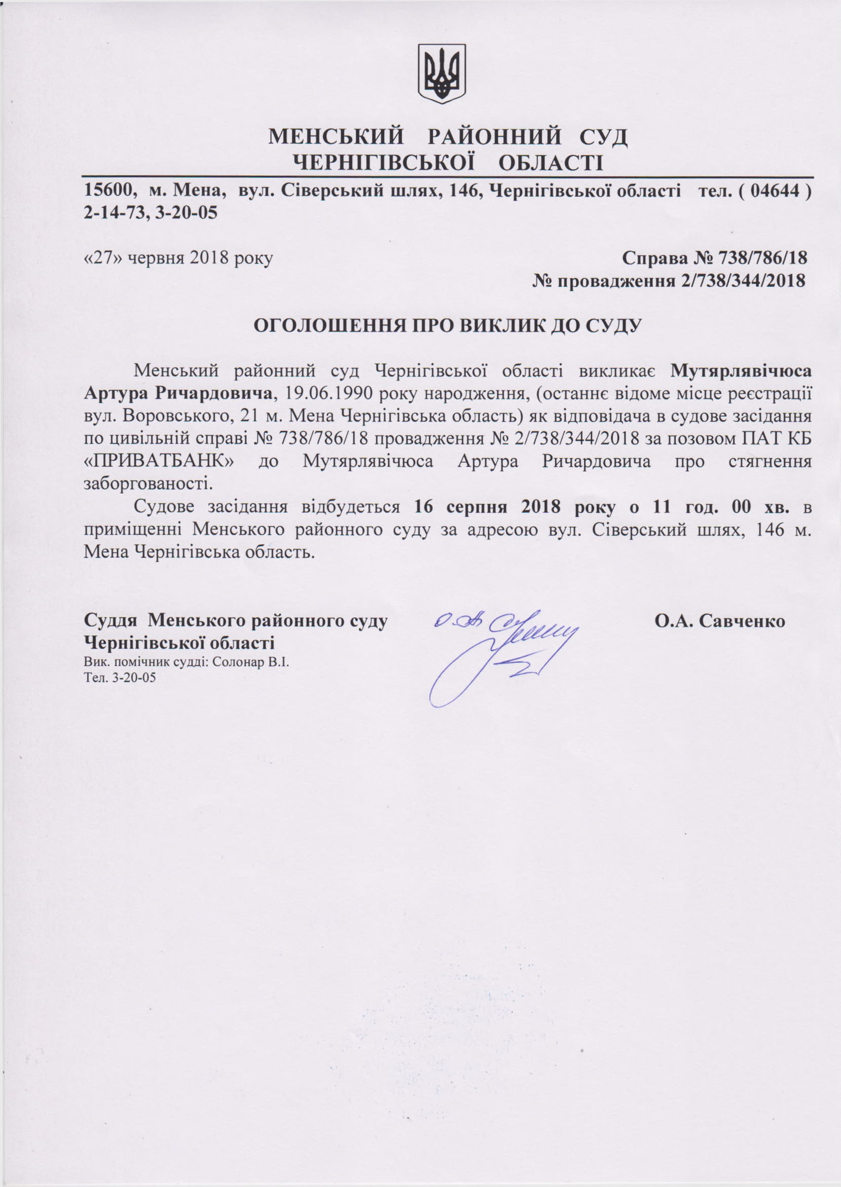 Оголошення про виклик до суду Мутярлявічюса Артура Ричардовича