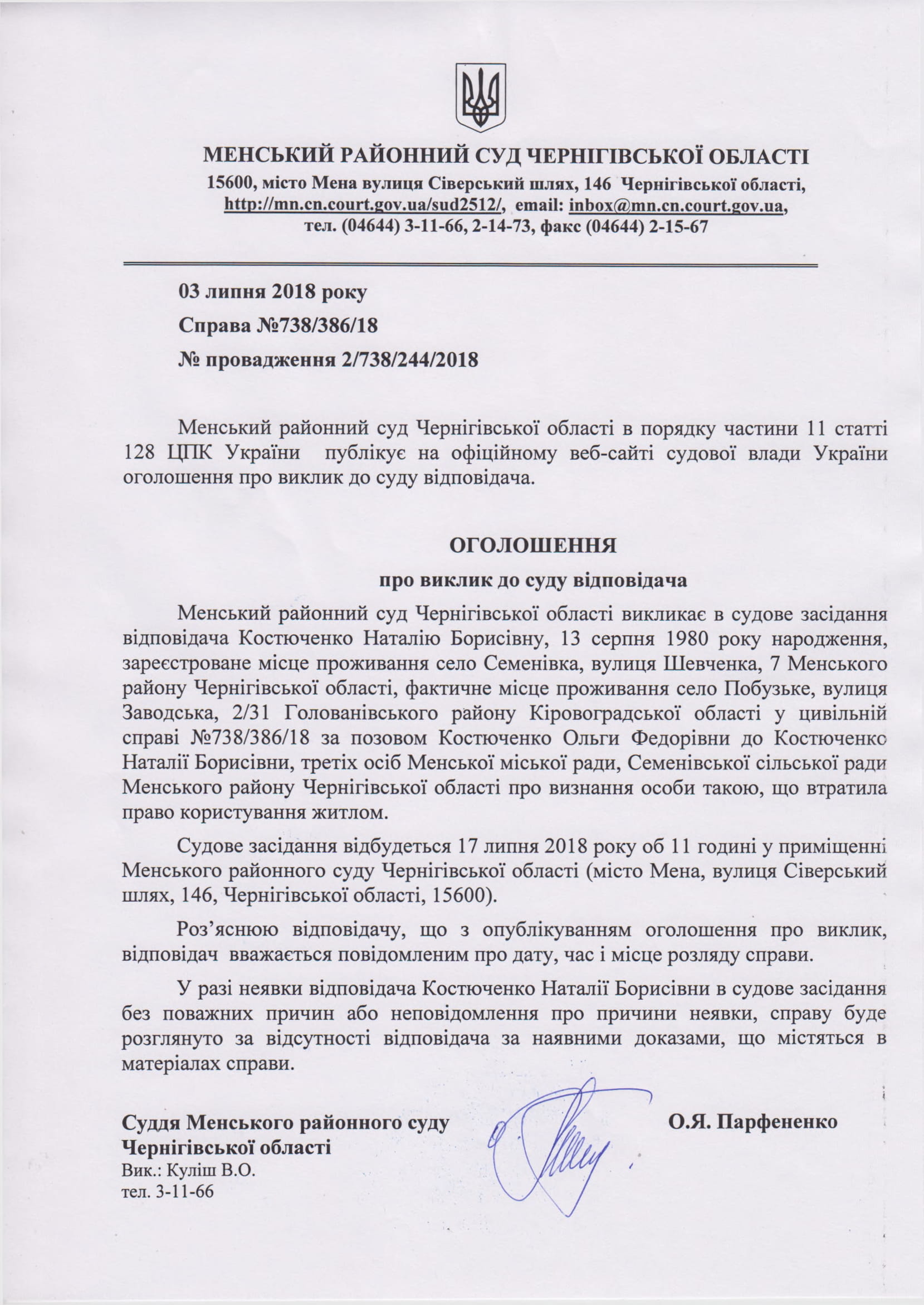 Оголошення про виклик до суду Костюченко Наталію Борисівну