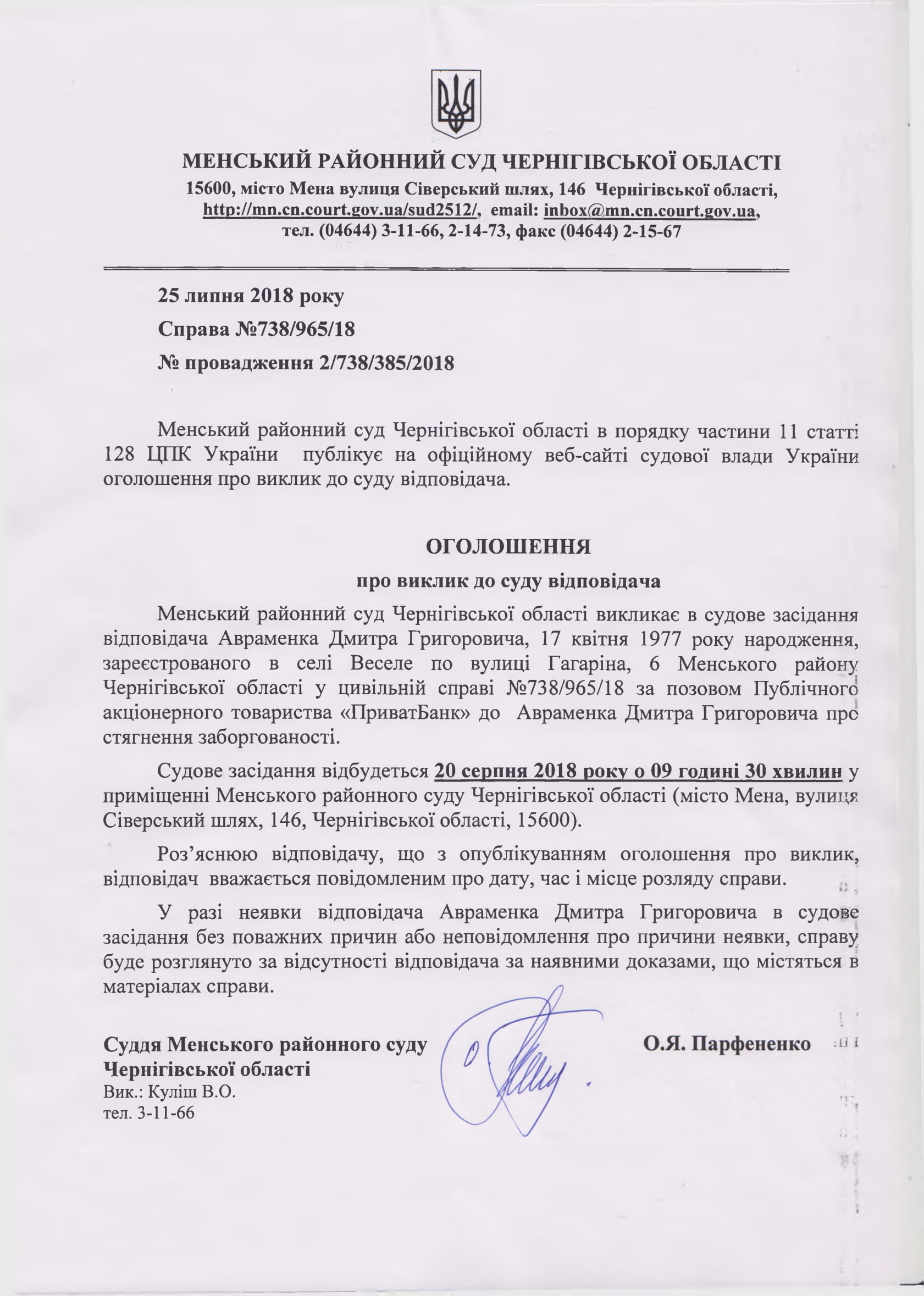 Оголошення про виклик до суду Авраменка Дмитра Григоровича
