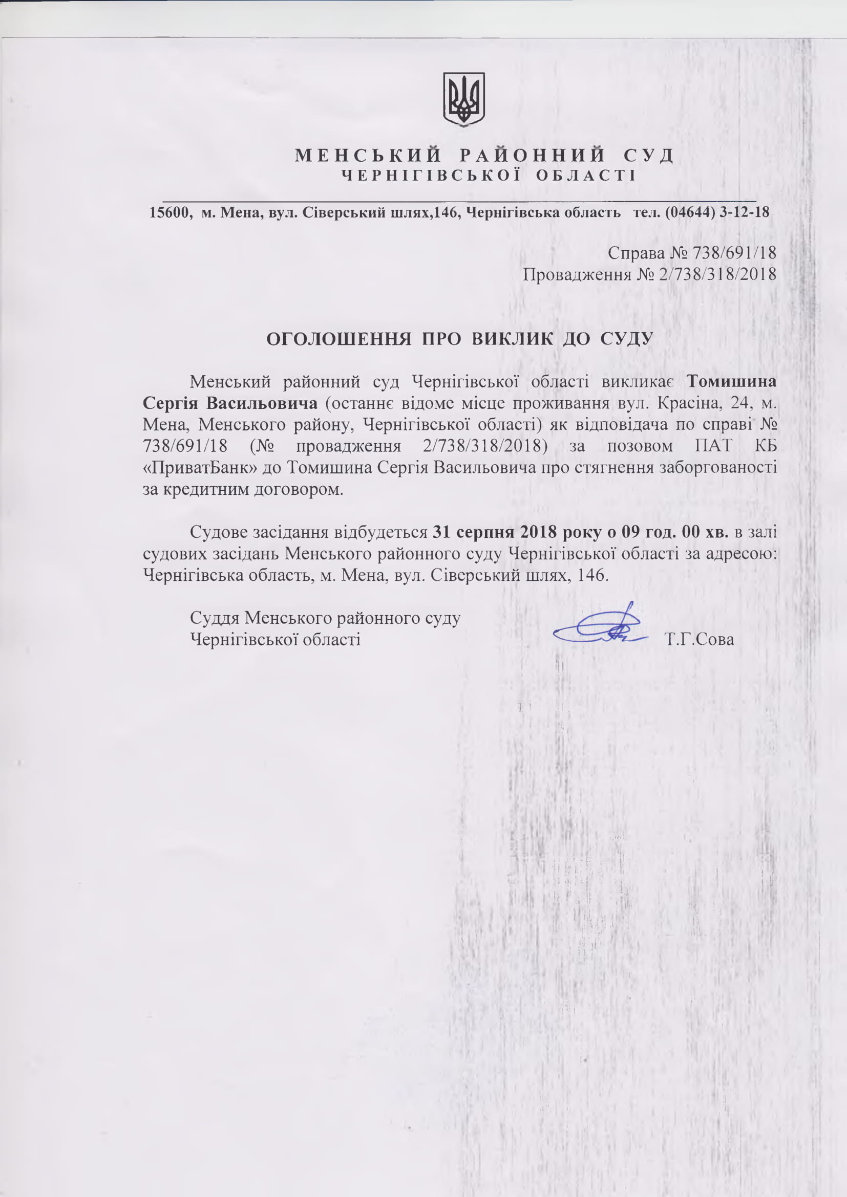 Оголошення про виклик до суду Томишина Сергія Васильовича