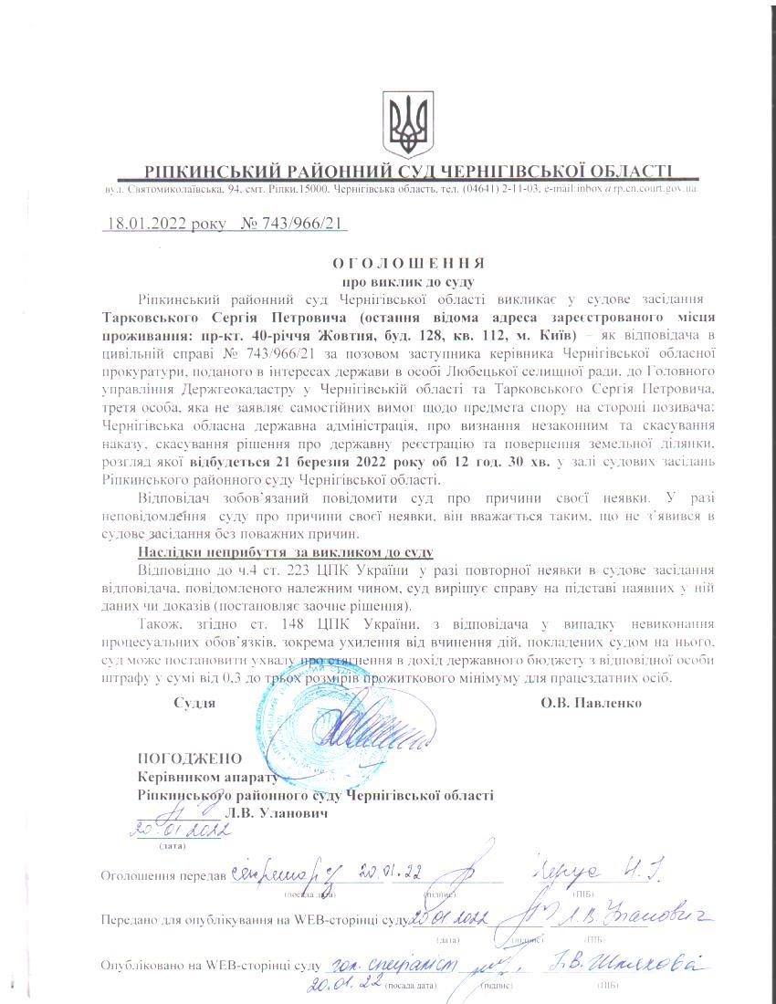 Оголошення про виклик до суду Тарковського С.П.