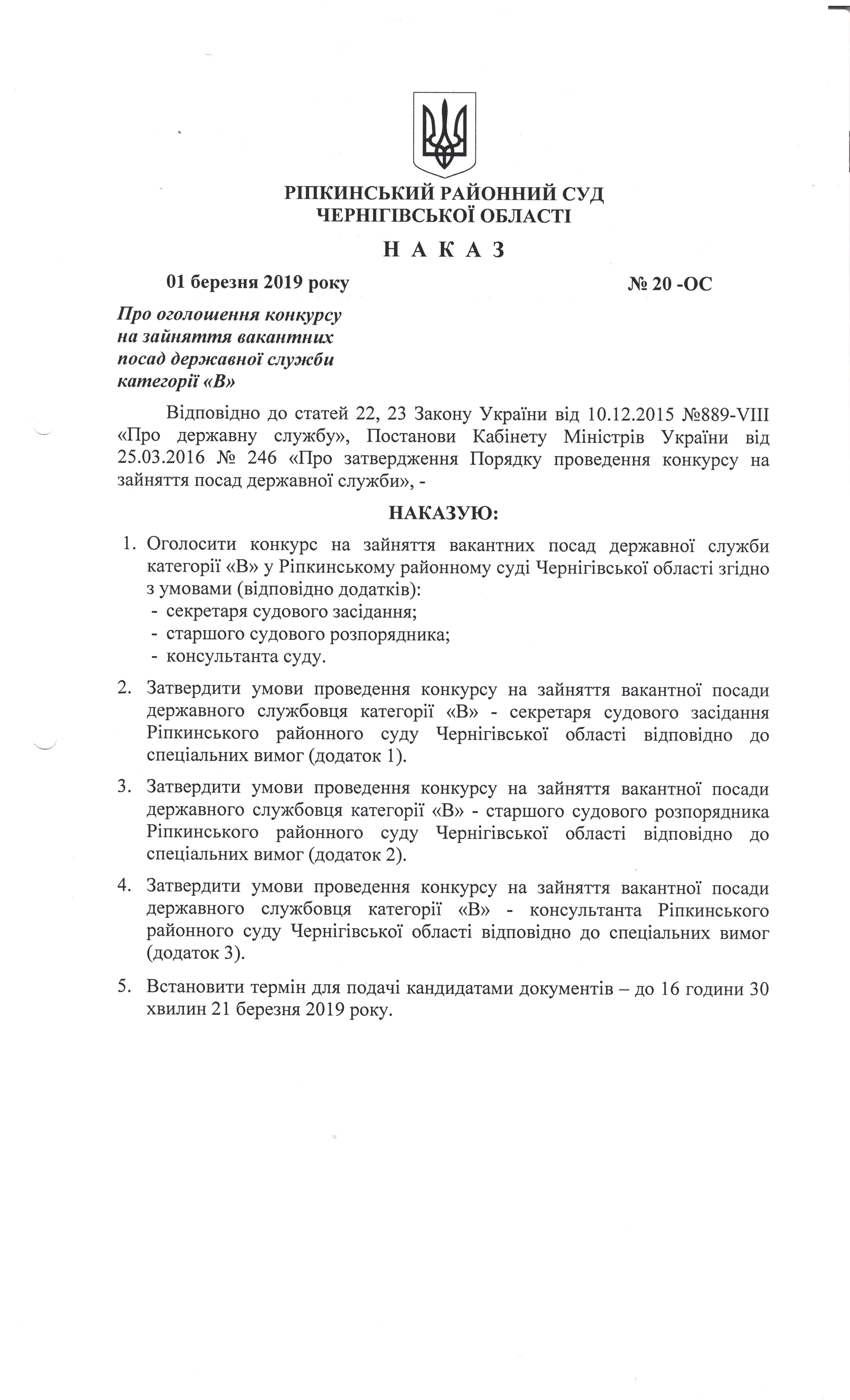 Відповідно до статті 23 Закону України «Продержавну службу» № 889 – VIII від 10.12.2015р., Положення про проведення конкурсів для призначення на посади державних службовців у судах, органах та установах системи правосуддя, затвердженого рішенням Вищоїради правосуддя № 2646/0/15-17 від 05.09.2017р., Порядку проведення конкурсу на заміщення посад державної служби, затвердженого постановою Кабінету Міністрів України № 246 від 25.03.2016 р. в редакції постанови Кабінету Міністрів України № 648 від 18.08.2017 р., зі змінами, Ріпкинський районний суд Чернігівської області 01 березня 2019 року оголошує конкурс на заміщення вакантних посад державної служби категорії «В» - секретаря судового засідання, консультанта суду та старшого судового розпорядника.
