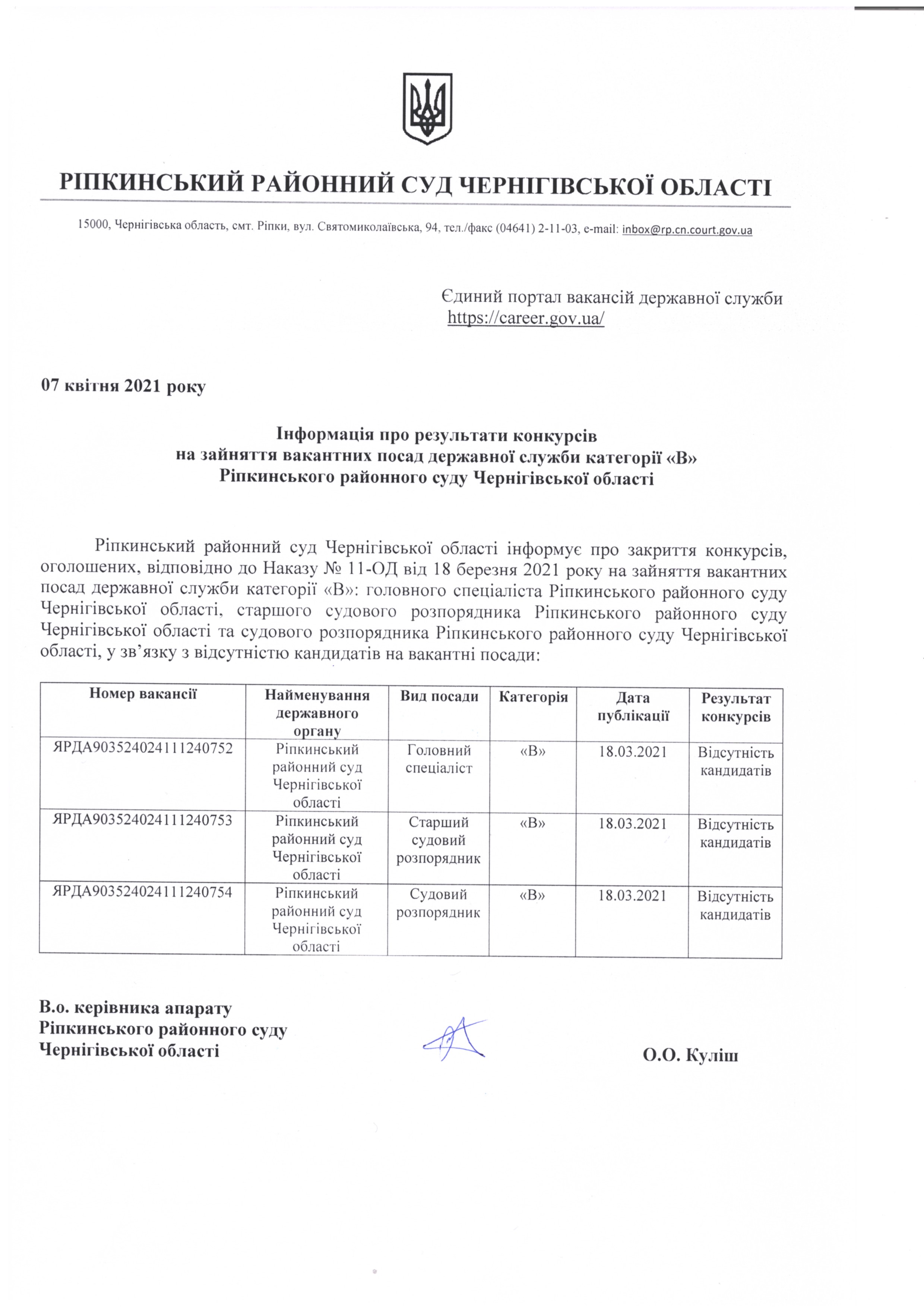 Інформація про результати конкурсів від 07.04.2021 року
