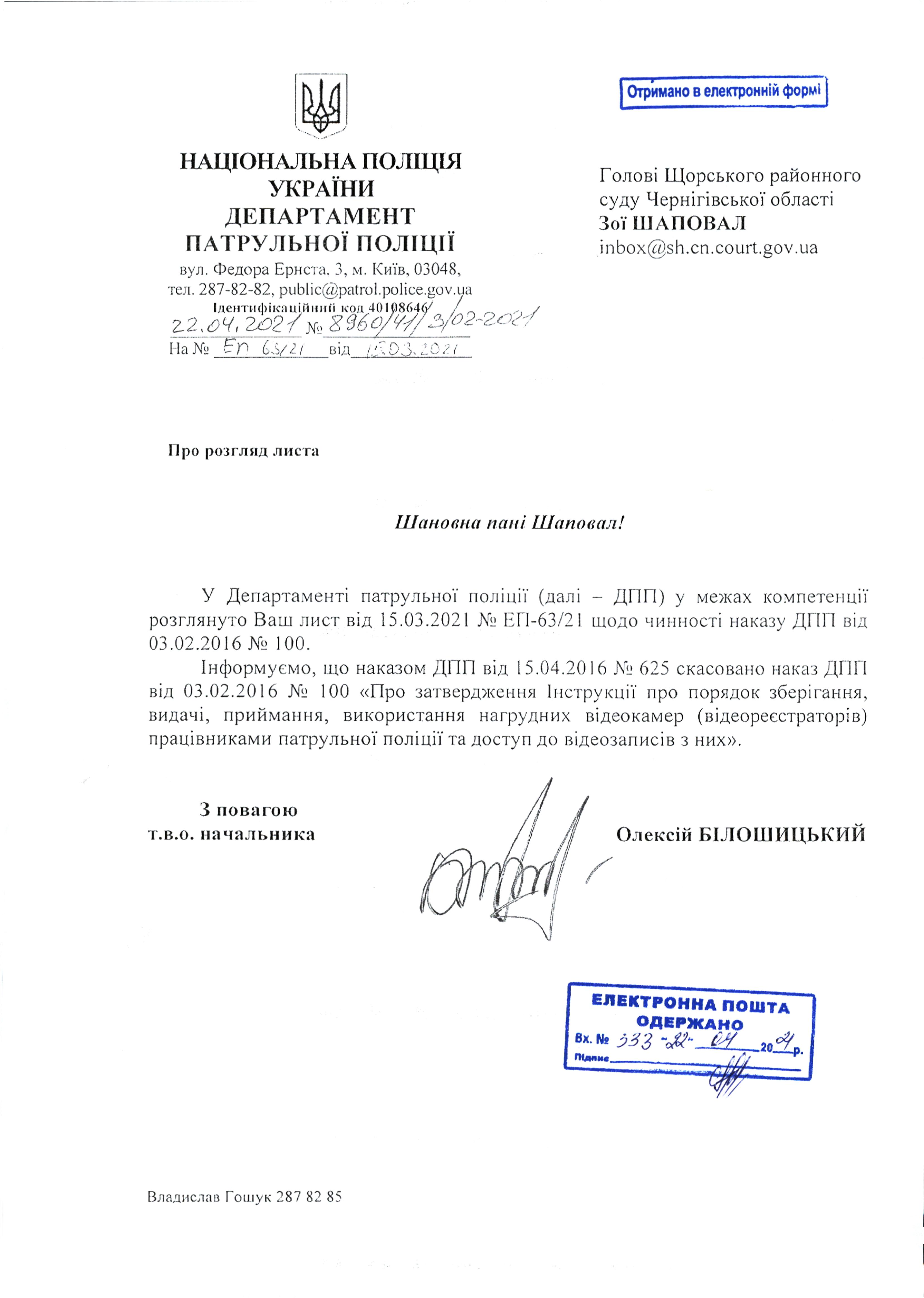 Повідомляємо про отриману від Департаменту патрульної поліції Національної поліції України інформацію щодо скасування наказу Департаменту патрульної поліції від 03.02.2016 р. № 100 " про затвердження Інструкції про порядок зберігання, видачі, приймання, використання нагрудних відеокамер (відеореєстраторів) працівниками патрульної поліції та доступ до відеозаписів з них".