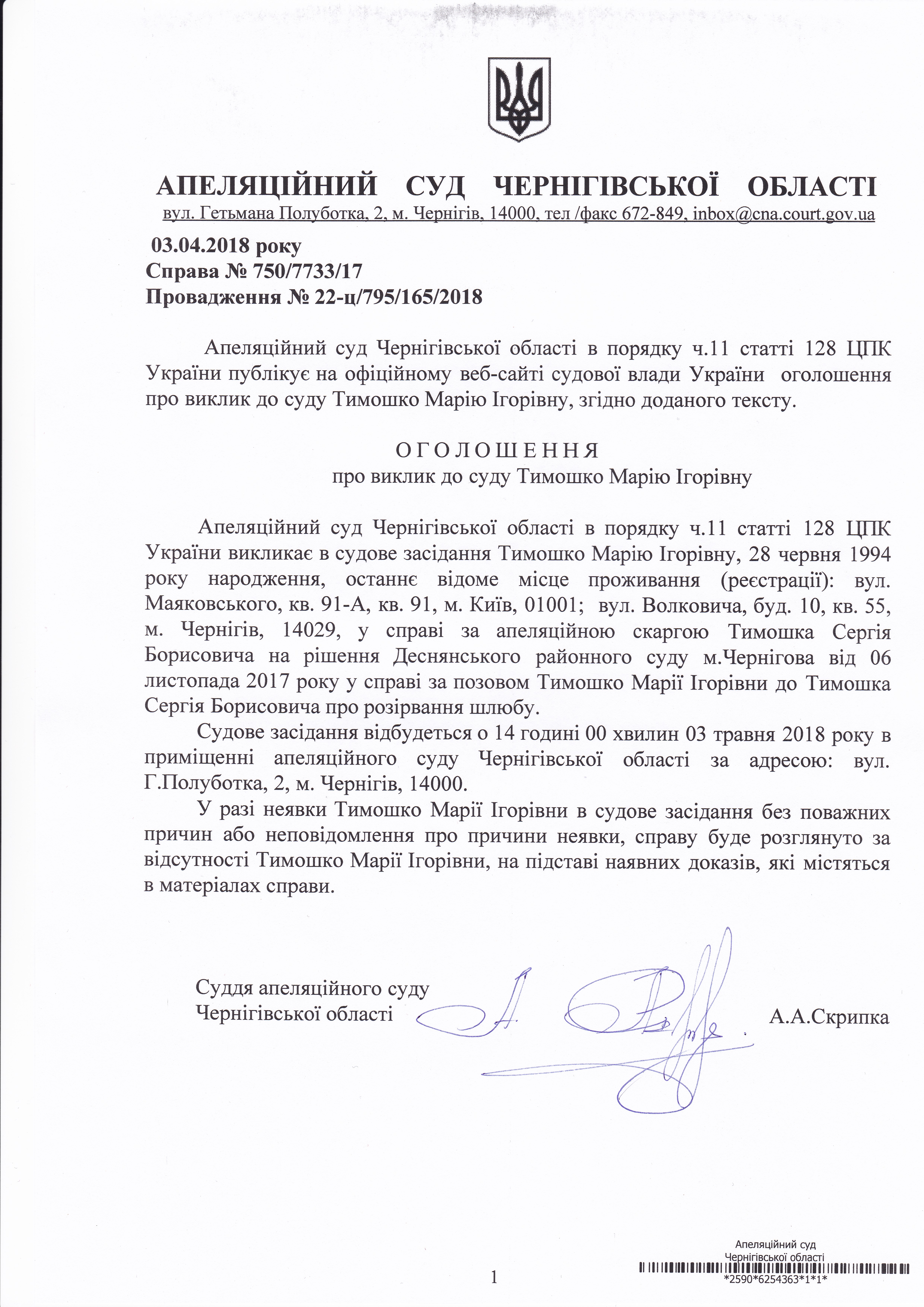 Виклик Тимошко Марії Ігорівни