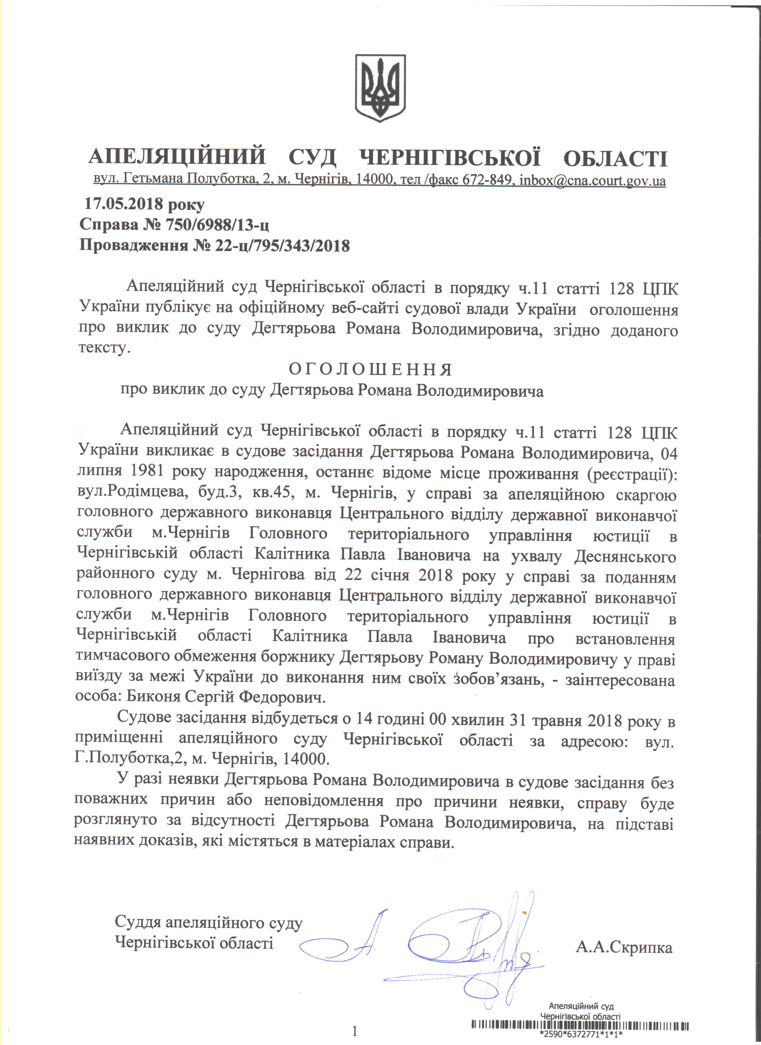 Виклик Дегтярьова Романа Володимировича