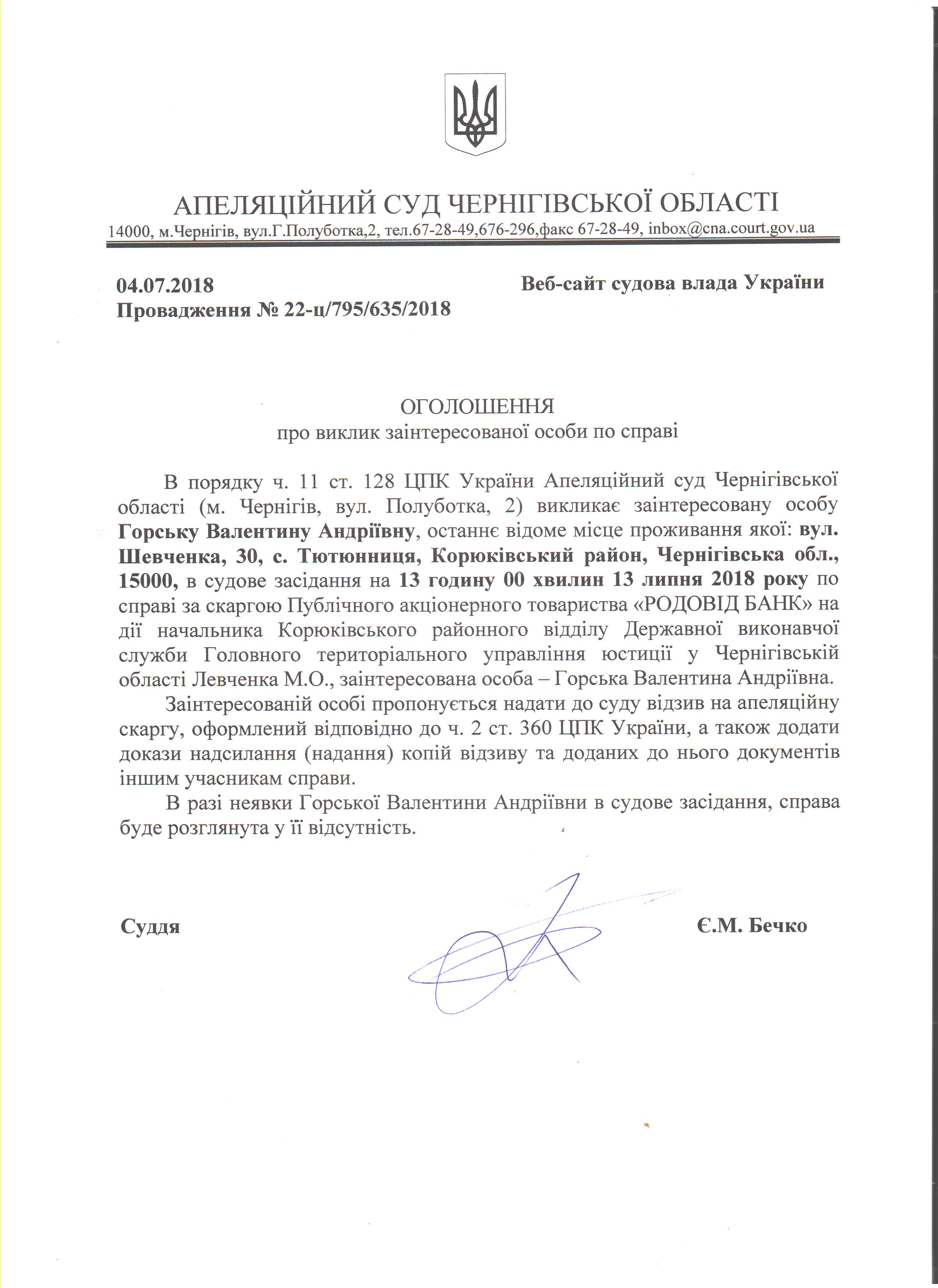 Виклик Горської Валентини Андріївни