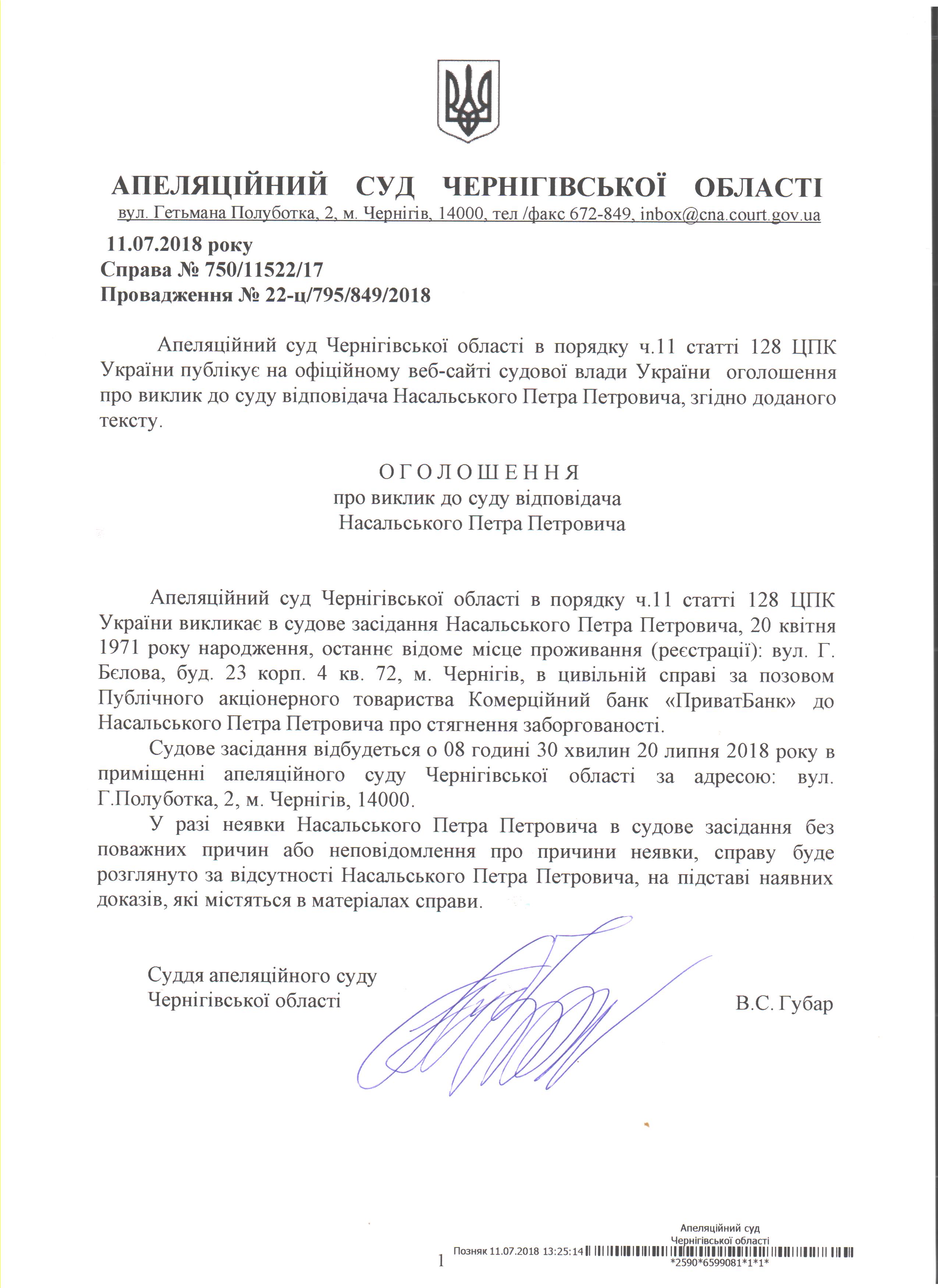 Виклик Насальського Петра Петровича