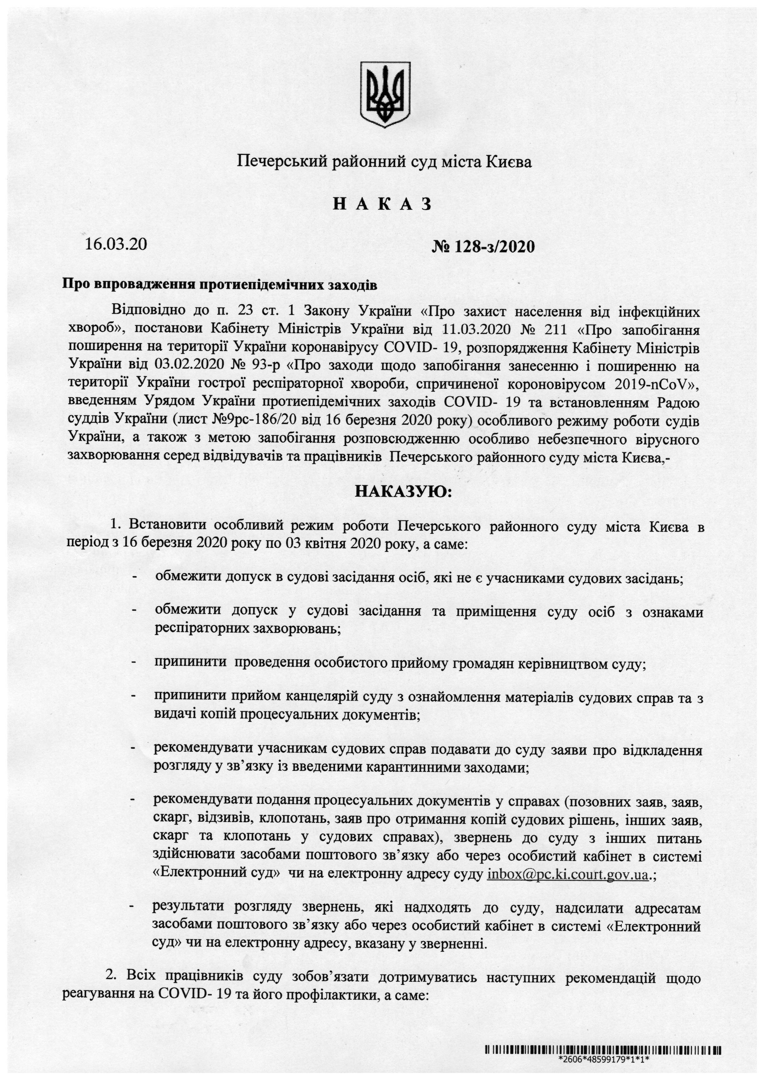 З метою убезпечити розповсюдження гострої респіраторної хвороби та масового поширення вірусної інфекції коронавірусу COVID-19 у Печерському районному суді міста Києва встановлено особливий режим роботи в період з 16 березня по 03 квітня 2020 року, а саме: