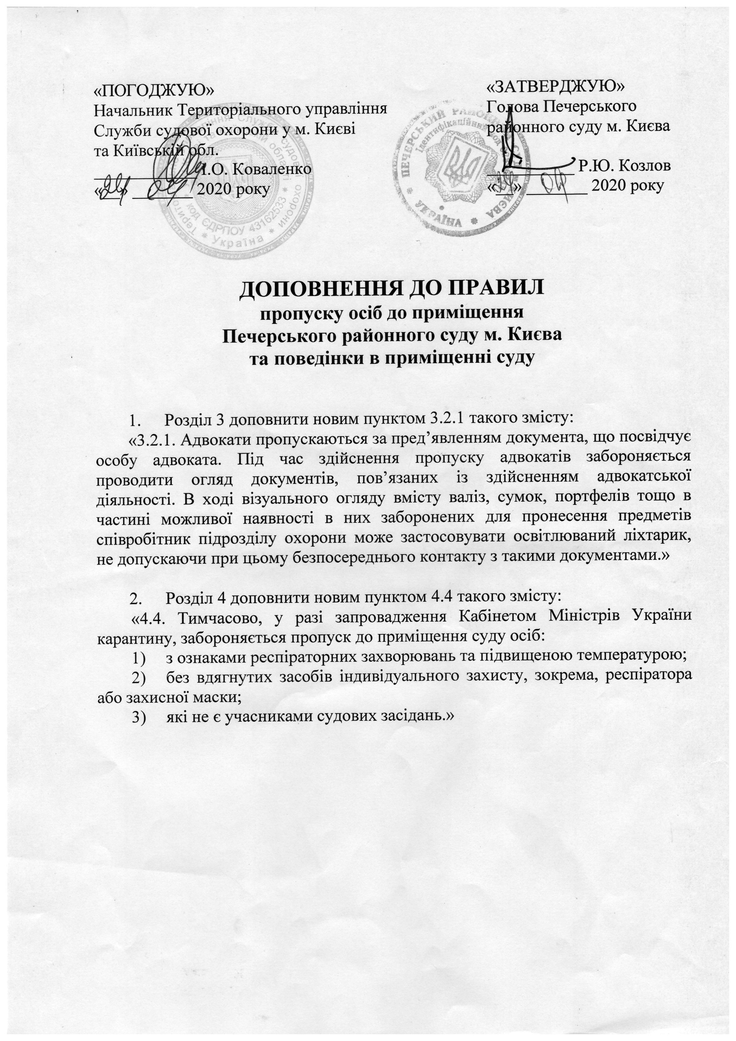 3.2. Пропуск до приміщення суду осіб, що прибули до суду, здійснюється на підставі документу, що посвідчує особу (паспорта громадянина України, паспорта громадянина України для виїзду за кордон, службового посвідчення, національного посвідчення водія України, пенсійного посвідчення, іншого офіційного документа, що містить фотокартку особи та печатку установи, що видала такий документ) та після занесення черговим співробітником підрозділу охорони даних щодо таких осіб до журналу обліку відвідувачів суду.