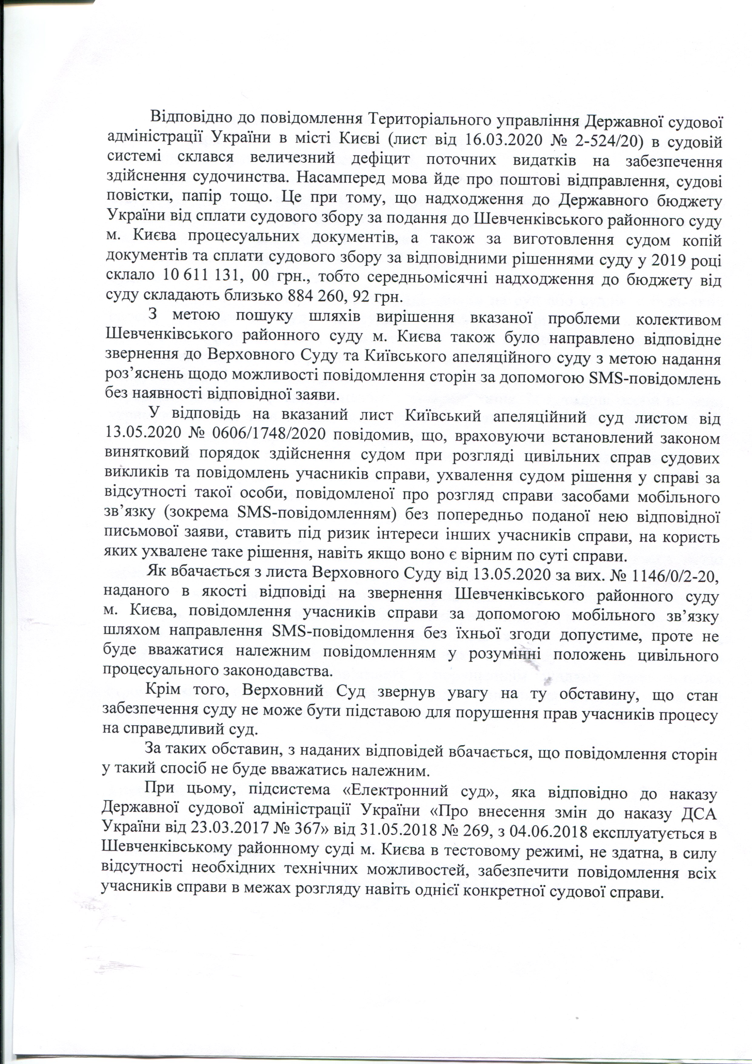 З метою вирішення ситуації, що склалася в Шевченківському районному суді з відправленням поштової кореспонденції, яка перешкоджає як належному повідомленню учасників справ про судові засідання, так і відправленню правосуддя в межах повноважень, визначених законом, Шевченківський районний суд міста Києва звернувся до Вищої ради правосуддя, Ради суддів України та Державної судової адміністрації України з листом (додається), в якому просив звернути увагу та врахувати вказані обставини при надходженні дисциплінарних скарг на суддів, пов’язаних з порушенням процесуальних строків розгляду справ, а також вжити необхідних заходів щодо ситуації, яка виникла внаслідок неналежного забезпечення фінансування діяльності суду щодо витрат, пов’язаних з відправленням поштової кореспонденції (судових повісток, копій процесуальних документів тощо).