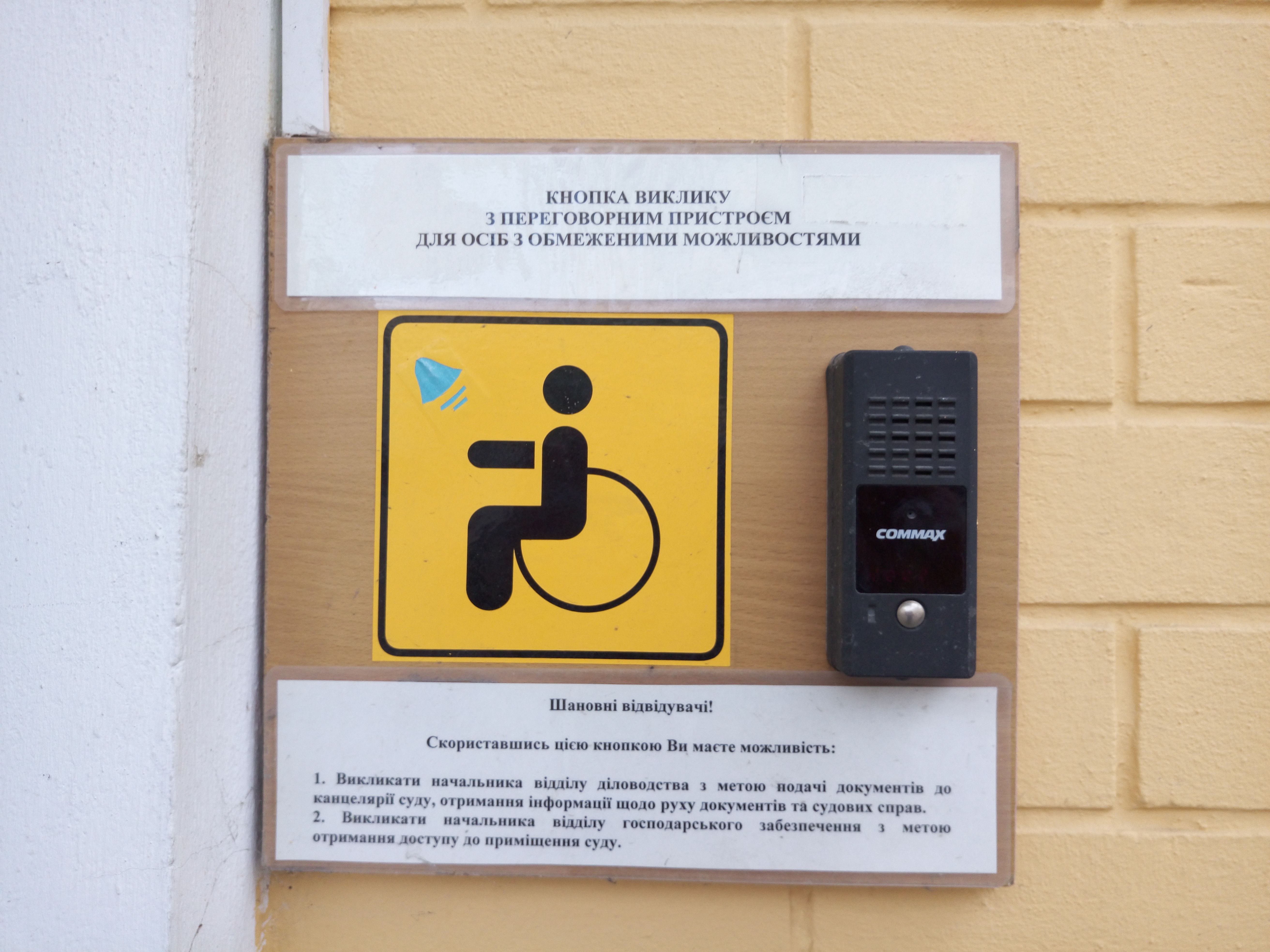 Будівля суду по вул. Б. Хмельницького №44-В має також службовий вхід із внутрішнім пандусом, який веде до залу судового засідання (ознайомлення з матеріалами справ) на 1 поверсі будівлі