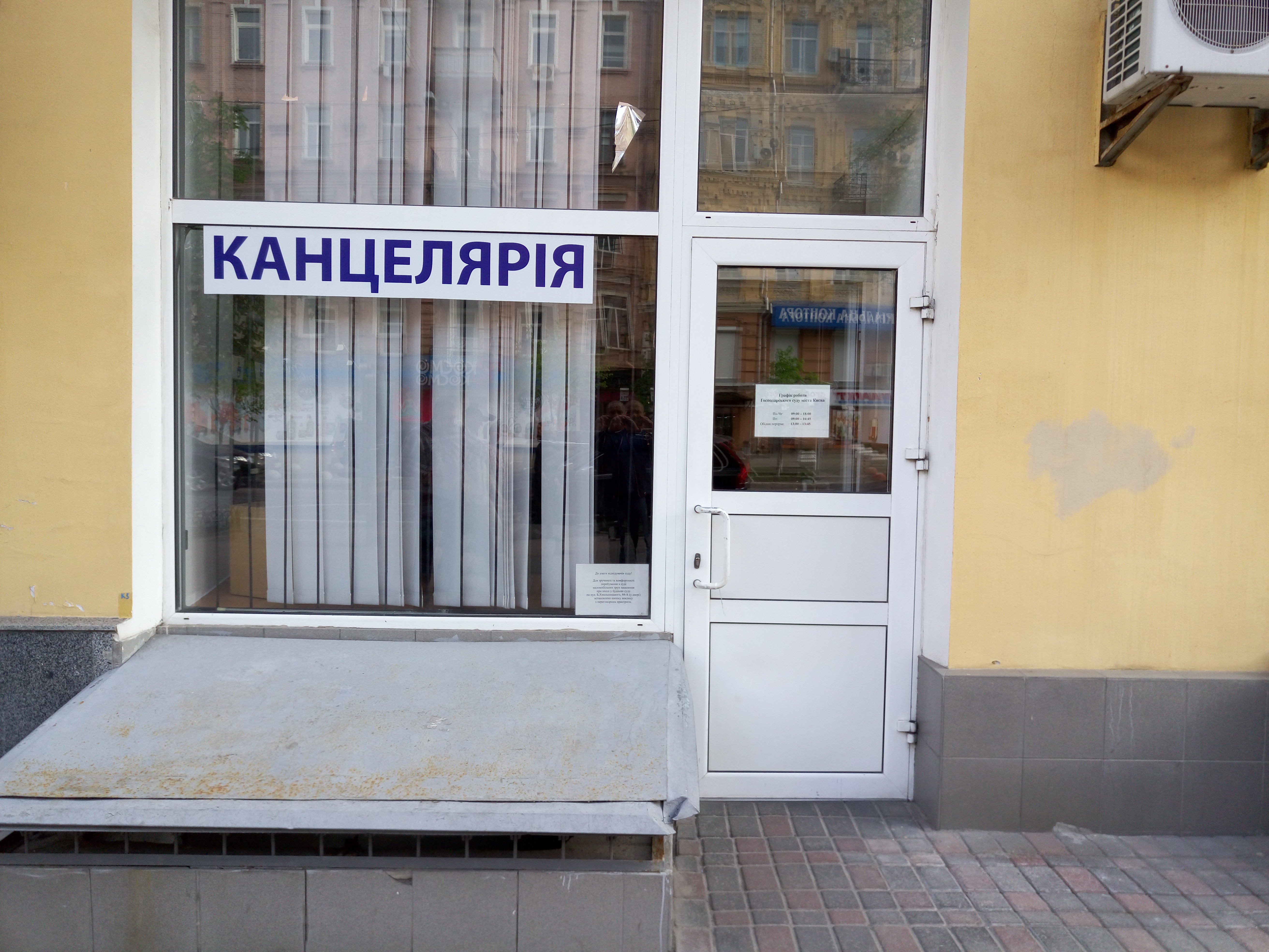 Оголошення біля входу до канцелярії у будівлі по Б.Хмельницького №44-А