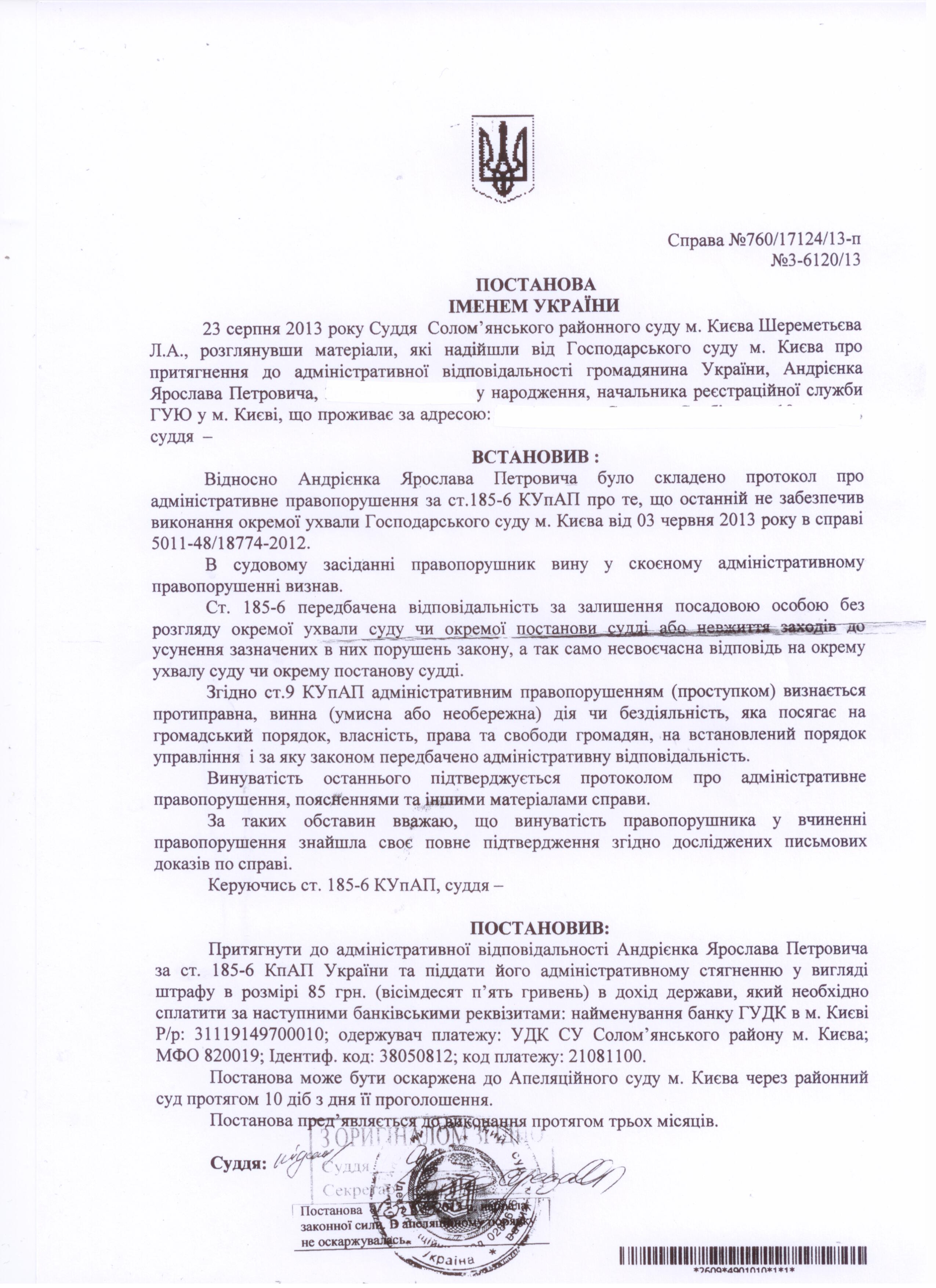 Адміністративний протокол складено за порушення ст. 185-6 КУаАП – невиконання вимог окремої ухвали господарського суду міста Києва.