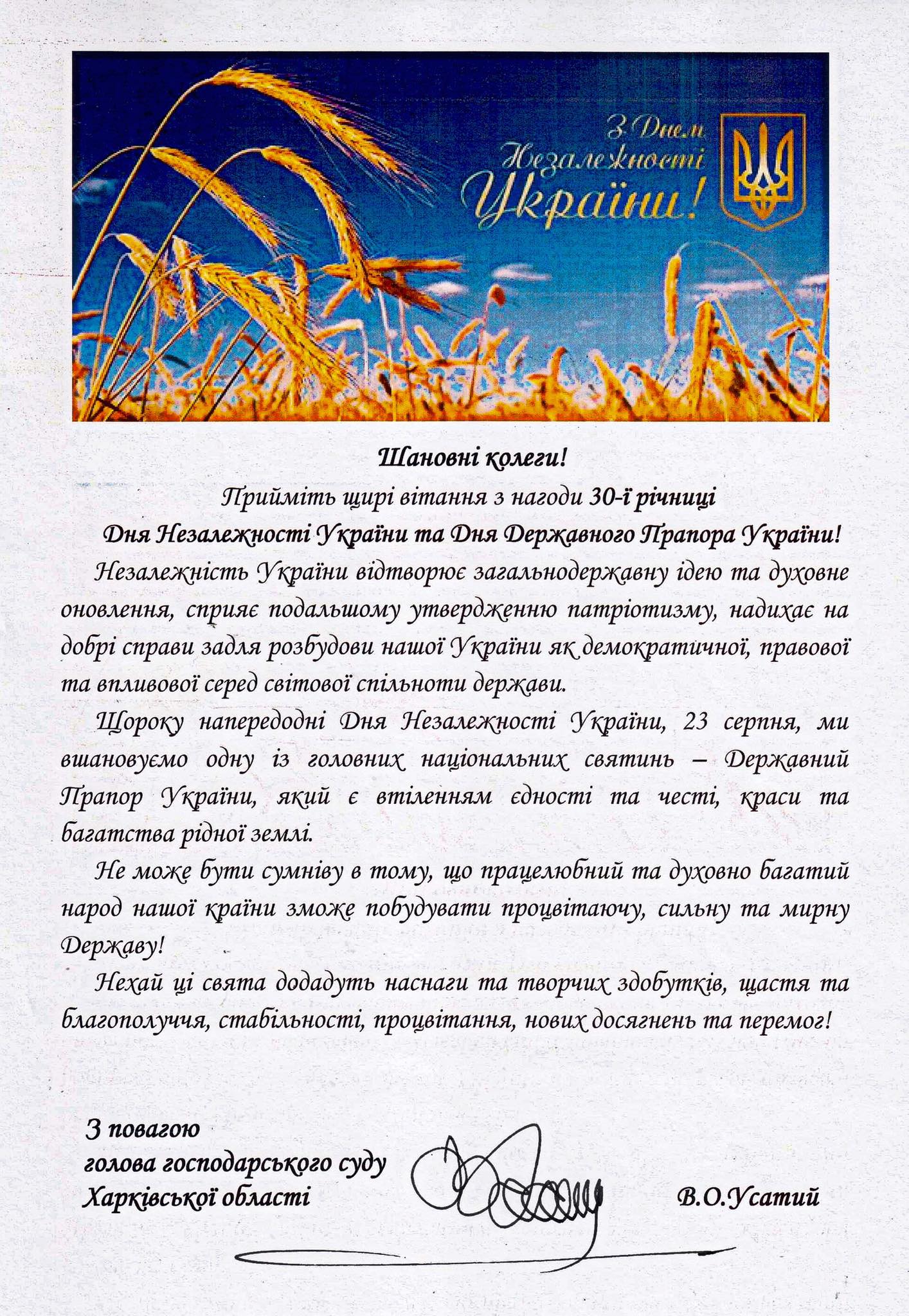 Привітання з нагоди 30-ї річниці Дня Незалежності України та Дня Державного Прапора України!