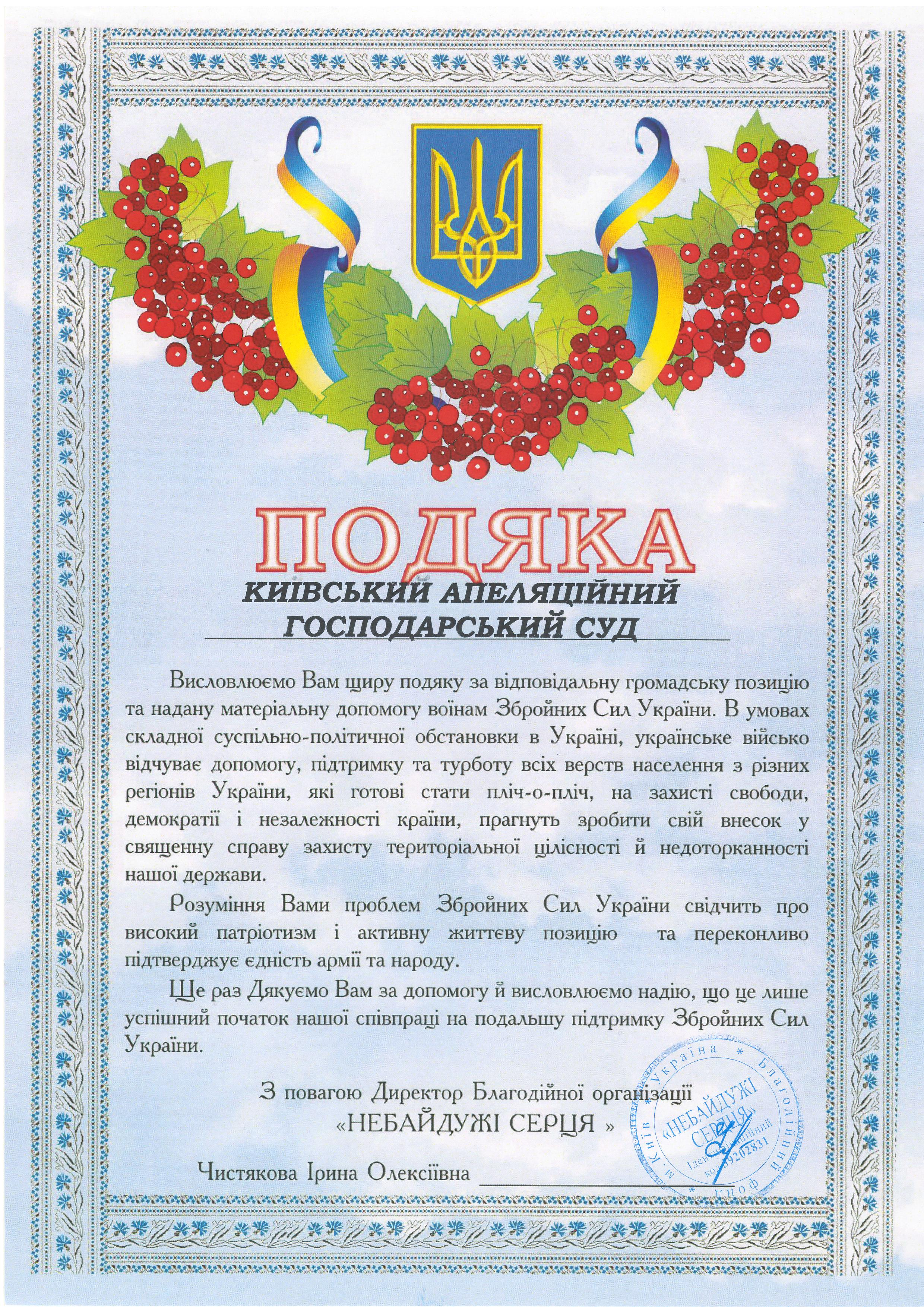 На адресу суду надійшов лист від Благодійної організації «Небайдужі серця», в якому висловлюється щира подяка колективу Київського апеляційного господарського суду за надану матеріальну допомогу воїнам Збройних Сил України.