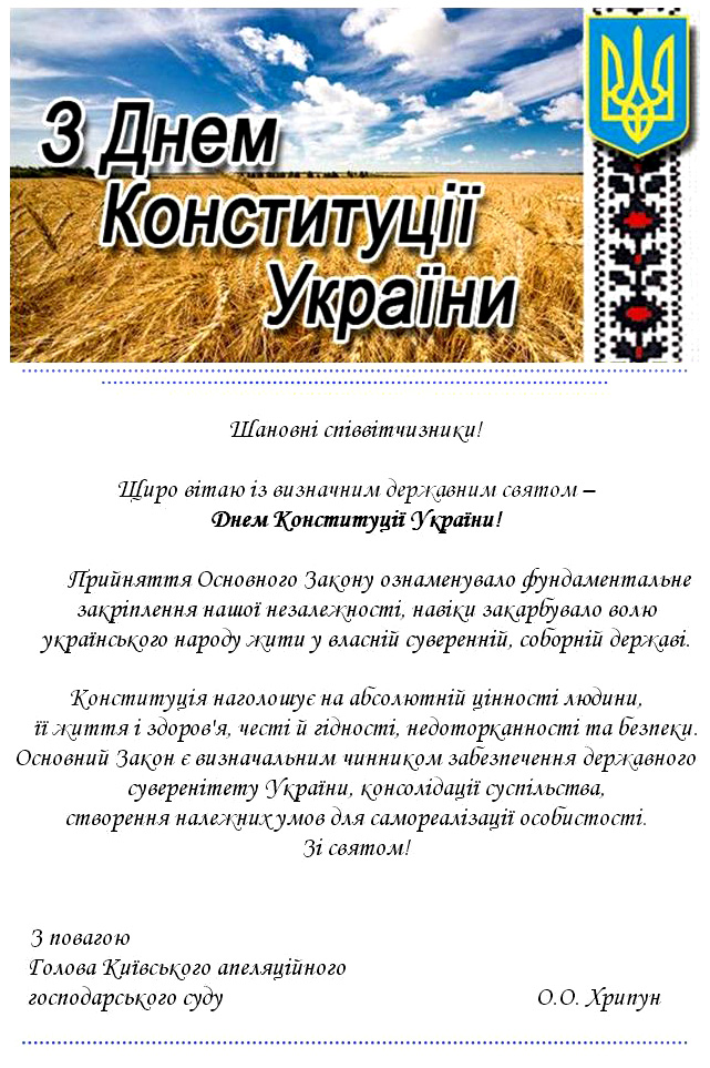 Привітання Голови Київського апеляційного господарського суду з Днем Конституції України