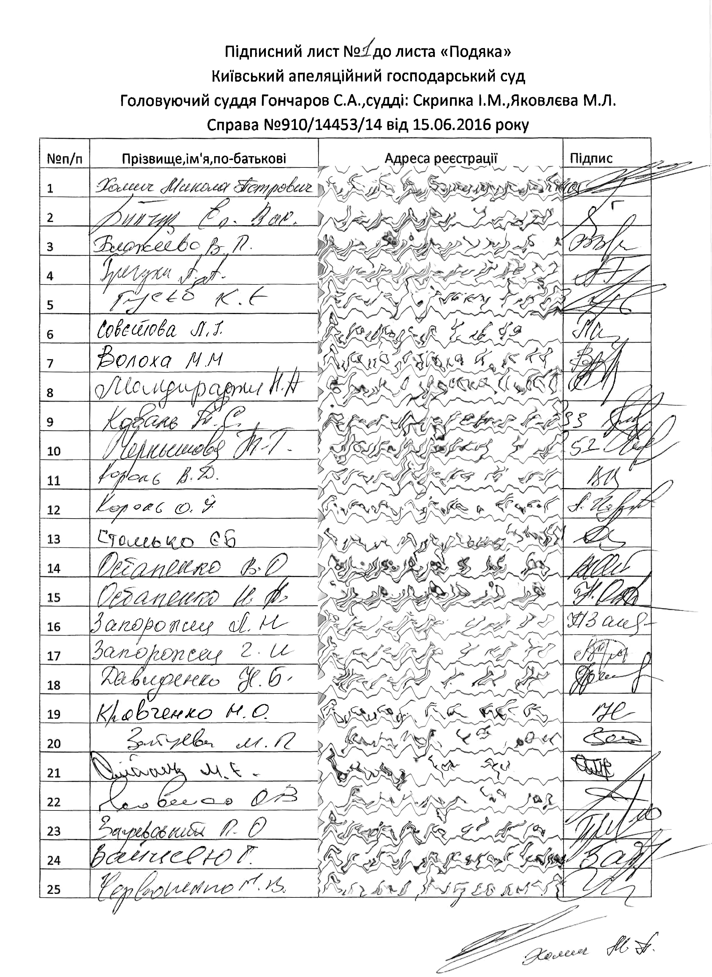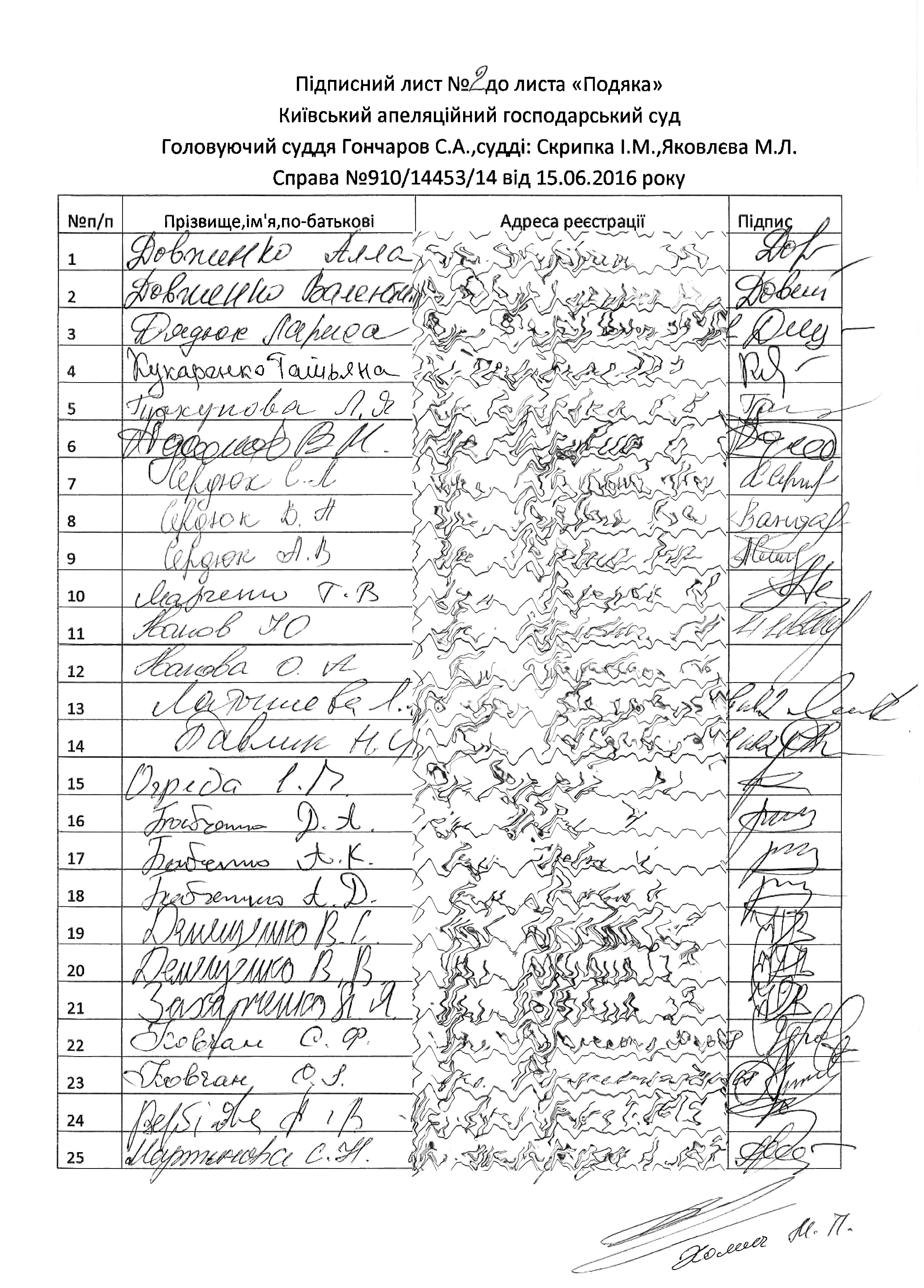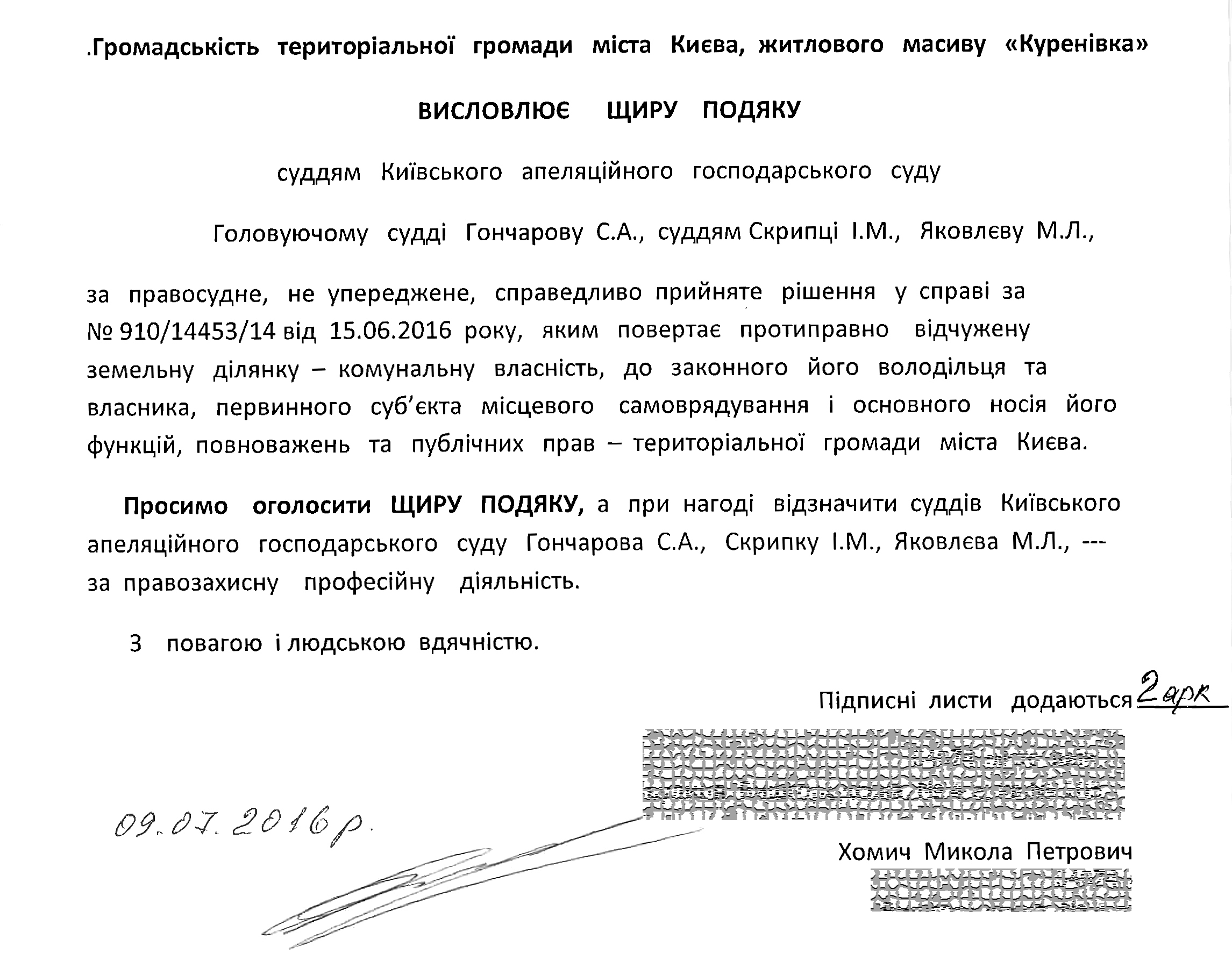 На адресу Київського апеляційного господарського суду надійшов лист від громадськості територіальної громади міста Києва, житлового масиву «Куренівка» з проханням висловити щиру подяку суддям Гончарову С.А., Скрипці І.М. та Яковлєву М.Л. за правосудне, не упереджене та справедливо прийняте рішення у справі № 910/14453/14, яким до комунальної власності міста, а головне - до законного користування жителів масиву, було повернуто протиправно відчужену земельну ділянку, на якій раніше був зелений сквер.