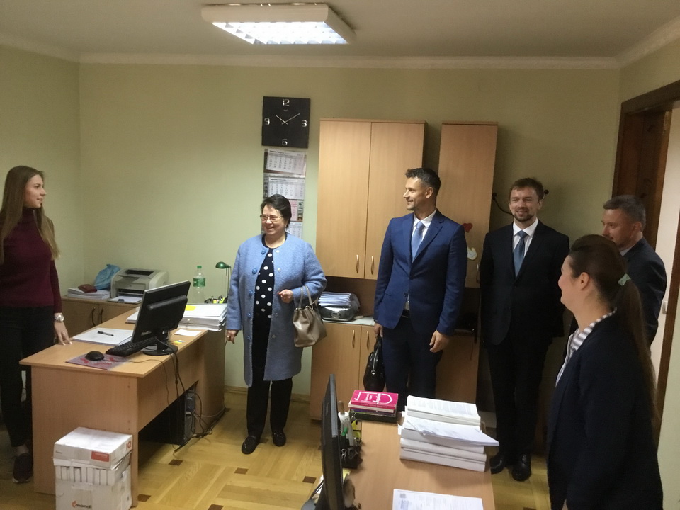 Голова суду провів делегацію у зали судових засідань, канцелярію, кабінети суддів, розповів про ремонтні роботи актової зали та плани на реконструкцію залів судових засідань для покращення умов перебування учасників судових процесів в суді.