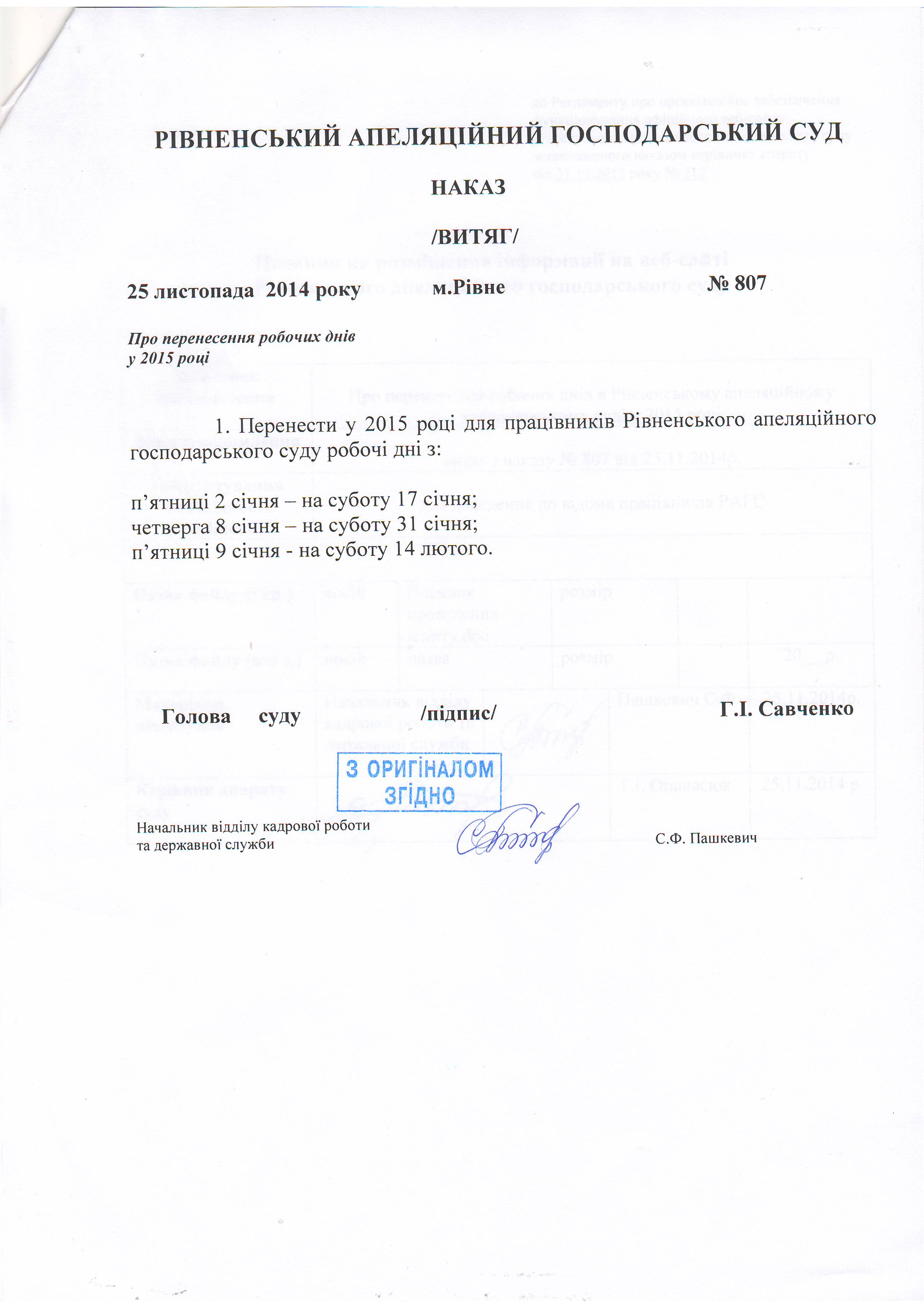 Перенесення робочих днів в Рівненському апеляційному господарському суді у 2015 році