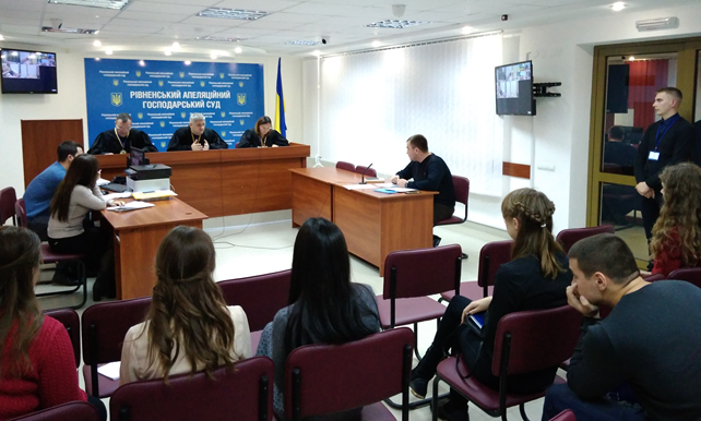 Сьогодні Рівненський апеляційний господарський суд приймав у себе студентів-правників вищих навчальних закладів Рівненщини – Рівненського інституту Київського університету права НАН України, Національного університету «Острозька академія», Міжнародного економіко-гуманітарного університету ім. Степана Дем’янчука та Національного університету водного господарства та природокористування.