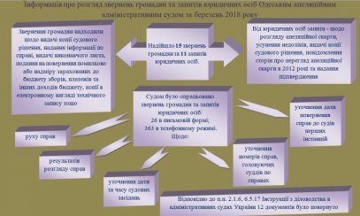 В період з 01 по 30 березня 2018 року до Одеського апеляційного адміністративного суду надійшло 15 звернень громадян та 11 запитів на отримання інформації від юридичних осіб. Зокрема: