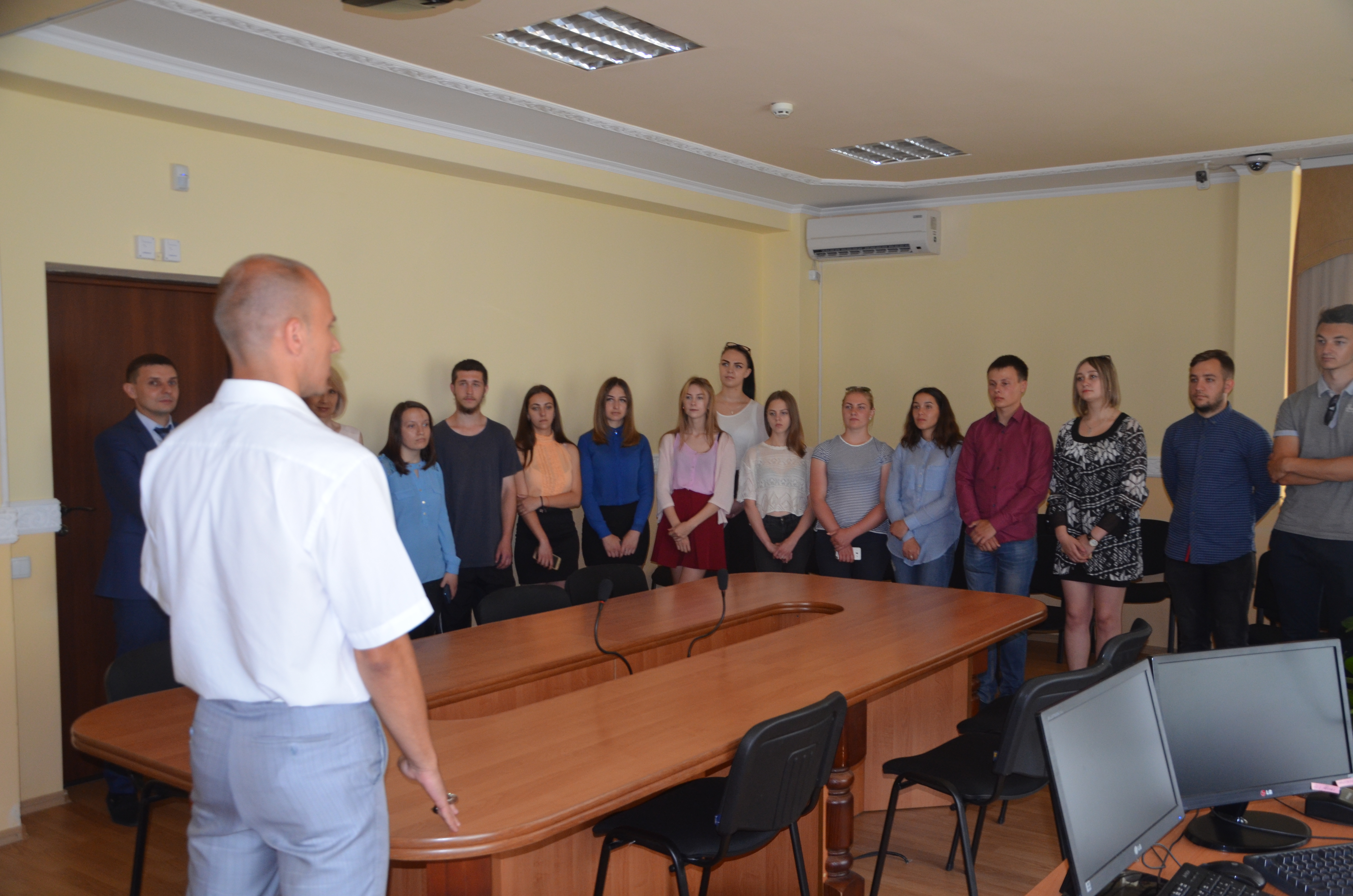 Начальник відділу забезпечення діяльності апарату суду Дмитрий Грубар ознайомив молодь з основами професії судді та діяльності судової системи, провів екскурсію в залі судових засідань, де студенти спробували посидіти в кріслах судової колегії та навіть з цікавістю зазирнули до нарадчої кімнати. Доповідач детально розказав студентам про роботу відділу забезпечення судового процесу, про роботу секретарів судових засідань, а секретар судового засідання Сербин Ірина (Ira Serbin) навіть провела майстер-клас по формуванню і підшиванню матеріалів справи.