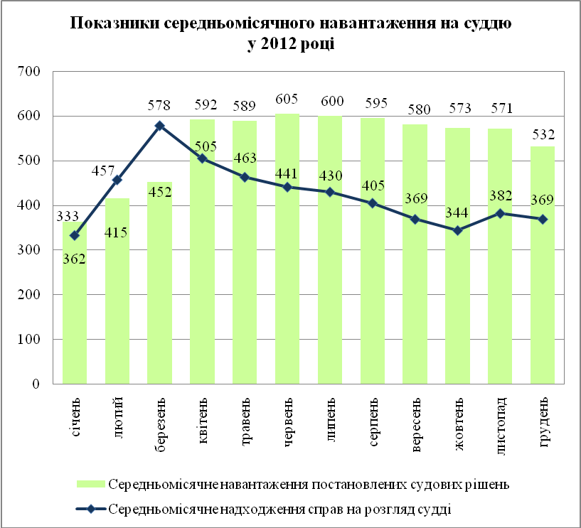 Слід відмітити позитивну тенденцію зменшення залишку нерозглянутих справ з 29409 справ (І півріччя) до 5979 справ (ІІ півріччя), що в свою чергу відобразилось і на показнику середньомісячного навантаження постановлених судових рішень, який у порівнянні з минулим роком постійно зростав і на кінець звітного періоду становить 532 (у 2011 році цей показник становив 190).
