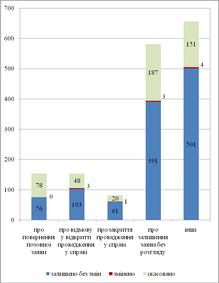 - 1132 ухвал залишено без змін (69,6%);