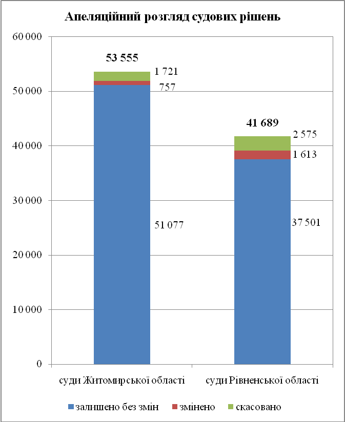 Житомирським апеляційним адміністративним судом впродовж звітного періоду переглянуто в апеляційному порядку 53 555 судових рішень судів Житомирської області (63%), з них 52704 постанови та 851 ухвала, та 41 689 судових рішень судів Рівненської області (37%), з них 40936 постанов та 753 ухвали, 32 судових рішення інших судів.