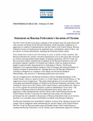 Асоціація адвокатів Нью-Йорку найрішучішим чином засуджує неспровоковане повномасштабне вторгнення Російської Федерації в Україну, яке є жахливим актом агресії, що порушує міжнародне право та Статут Організації Об'єднаних Націй. Війська Російської Федерації атакують густонаселені райони, в тому числі столицю Київ, та ключові об'єкти критичної інфраструктури, зокрема Чорнобильську атомну станцію.