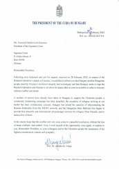 У відповідь на Вашу заяву і заклик до надання підтримки, отримані 28 лютого 2022 року, стосовно вторгнення Російської Федерації на територію України хочу повідомити, що Угорщина і угорський народ підтримують територіальну цілісність і суверенітет України, і що Угорщина закликає Російську Федерацію і України провести мирні перемови якомога раніше з метою припинення будь-якого військового конфлікту і нападу.