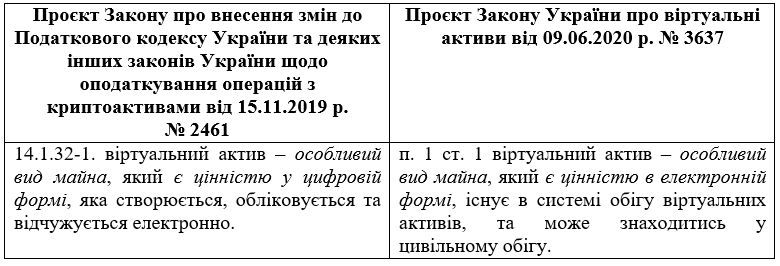 Отже, у законопроєкті № 2461 пропонується внести до Податкового кодексу України такі зміни, а саме, п. 14.1 ст. 14 доповнити підпунктом 14.1.95-1 такого змісту: «14.1.95-1 криптоактив – вид віртуального активу у формі токену, який створюється, обліковується та відчужується в розподіленому реєстрі та не посвідчує майнових та/або немайнових прав власника криптоактиву». Звичайно ж передбачається доповнити п. 14.1 ст. 14 Податкового кодексу України підпунктом 14.1.32-1 такого змісту: «14.1.32-1 віртуальний актив – особливий вид майна, який є цінністю у цифровій формі, яка створюється, обліковується та відчужується електронно. До віртуальних активів відносяться криптоактиви, токен-активи та інші віртуальні активи».
